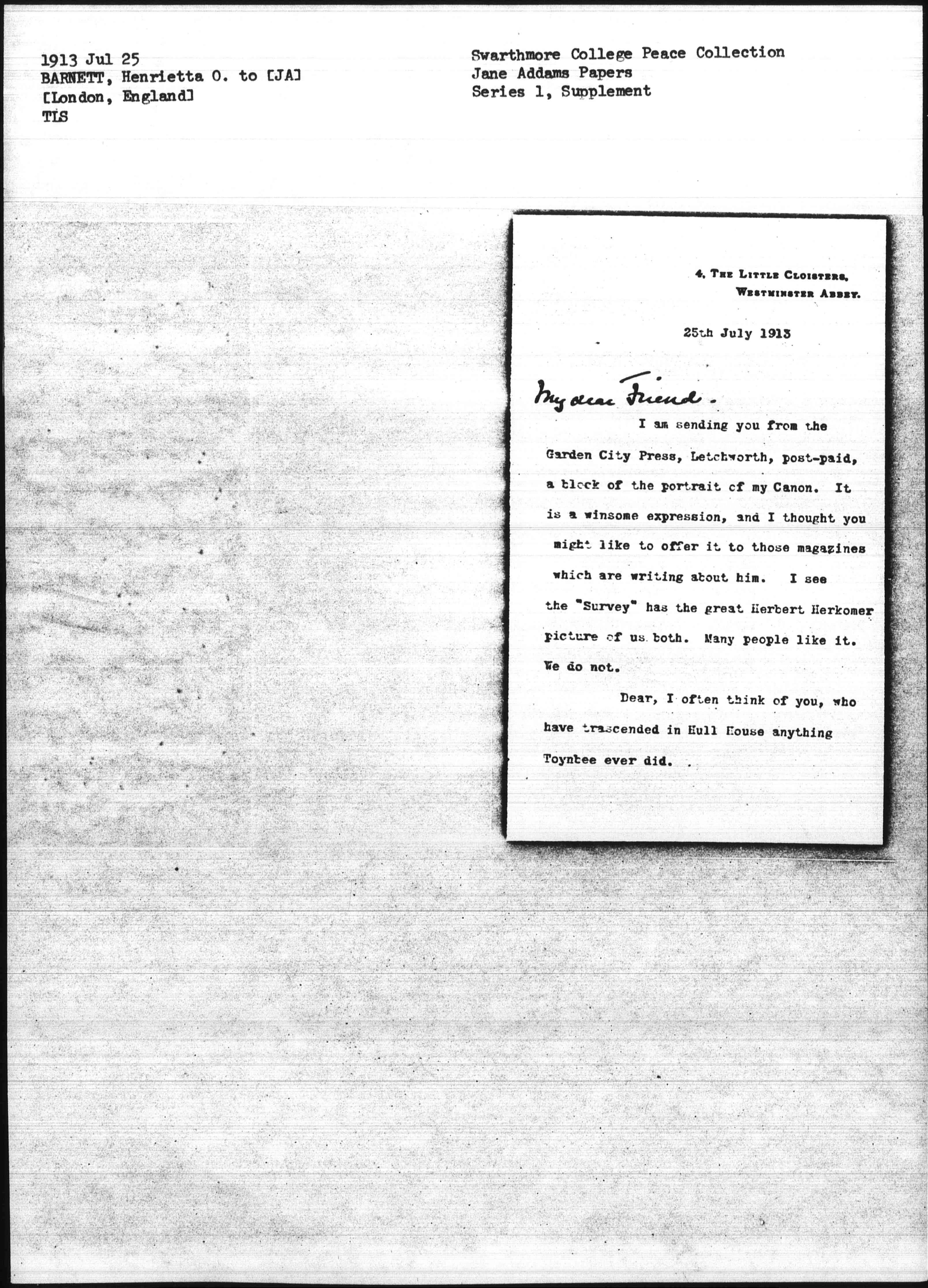 Dear, I often think of you, who have transcended in Hull House anything Toynbee ever did. [page 2]