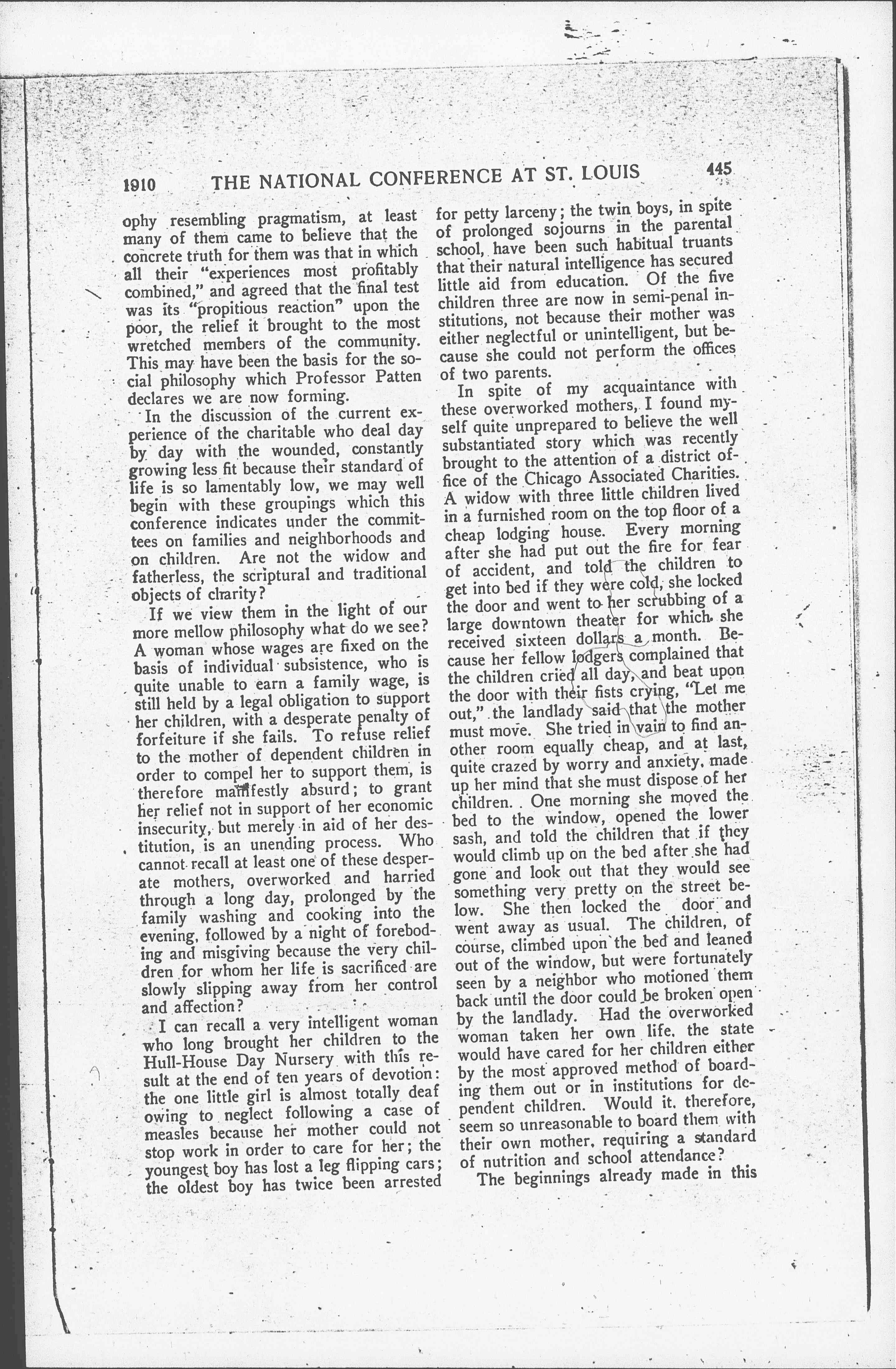 In spite of my acquaintance with these overworked mothers, I found myself quite unprepared to believe the well substantiated story which was recently brought to the attention of a district office of the Chicago Associated Charities. A widow with three little children lived in a furnished room on the top floor of a cheap lodging house. Every morning after she had put out the fire for fear of accident, and told the children to get into bed if they were cold, she locked the door and went to her scrubbing of a large downtown theater for which she received sixteen dollars a month. Because her fellow lodgers complained that the children cried all day, and beat upon the door with their fists crying, "Let me out," the landlady said that the mother must move. She tried in vain to find another room equally cheap, and at last, quite crazed by worry and anxiety, made up her mind that she must dispose of her children. One morning she moved the bed to the window, opened the lower sash, and told the children that if they would clumb up on the bed after she had gone and look out that they would see something very pretty on the street below. She then locked the door and went away as usual. The children, of course, climbed upon the bed and leaned out of the window, but were fortunately seen by a neighbor who motioned them back until the door could be broken open by the landlady. Had the overworked woman taken her own life, the state would have cared for her children either by the most approved method of boarding them out or in institutions for dependent children. Would it, therefore, seem so unreasonable to board them with their own mother, requiring a standard of nutrition and school attendance?