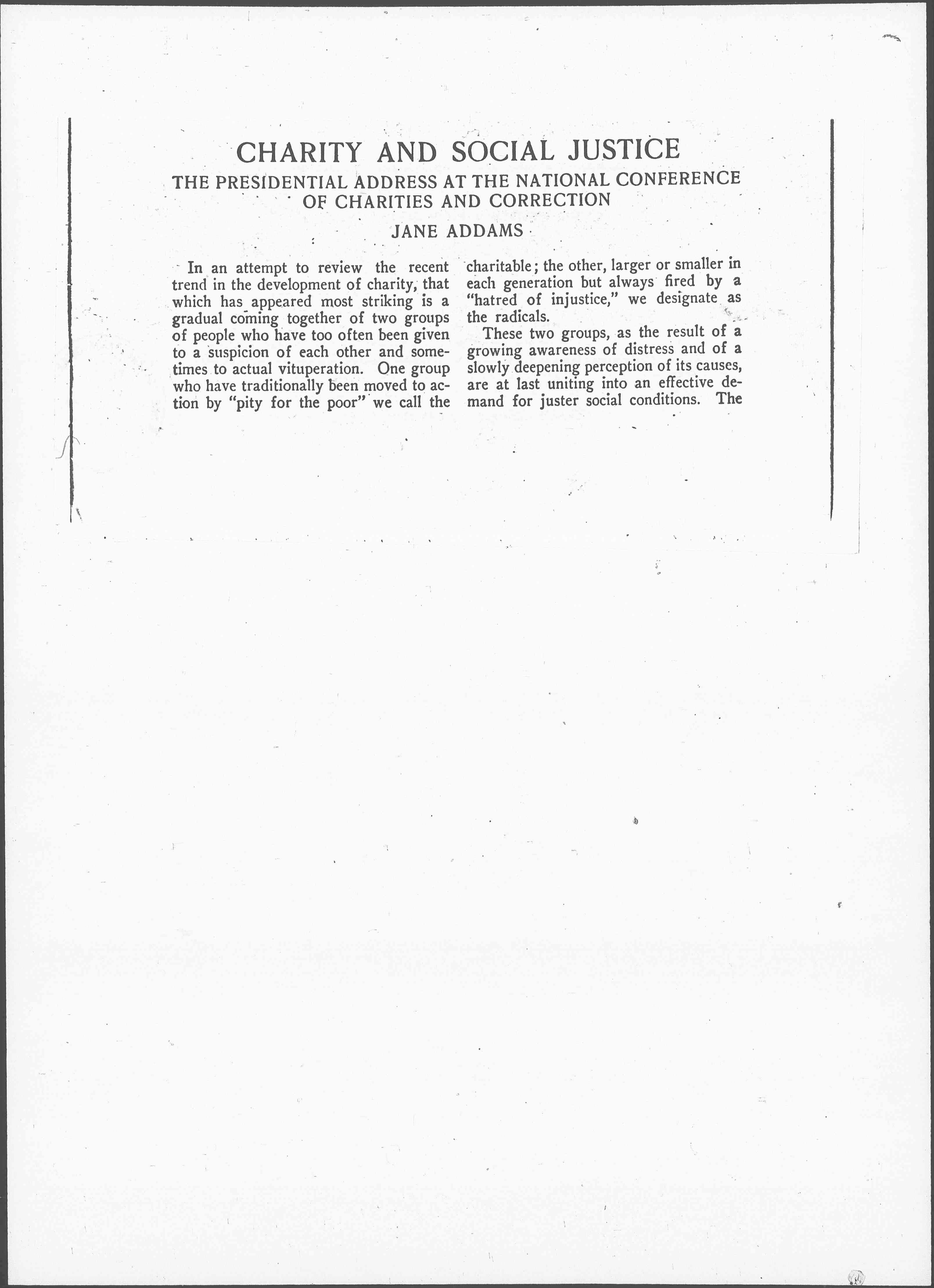 In an attempt to review the recent trend in the development of charity, that which has appeared most striking is a gradual coming together of two groups of people who have too often been given to a suspicion of each other and sometimes to actual vituperation. One group who have traditionally been moved to action by "pity for the poor" we call the charitable; the other, larger or smaller in each generation but always fired by a "hatred of injustice," we designate as the radicals.
