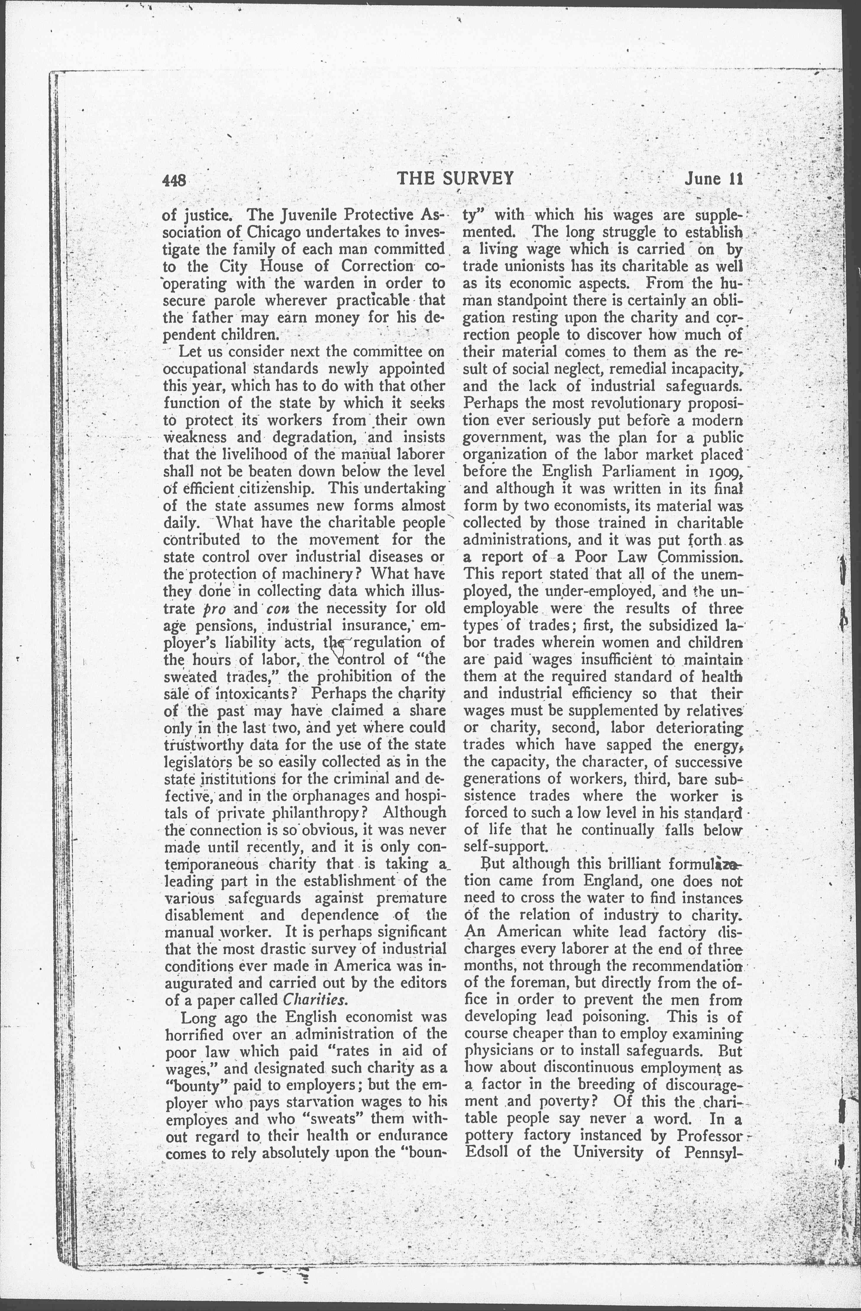 Long ago the English economist was horrified over an administration of the poor law which paid "rates in aid of wages," and designated such charity as a "bounty" paid to employers; but the employer who pays starvation wages to his [employees] and who "sweats" them without regard to their health or endurance comes to rely absolutely upon the "bounty" with which his wages are supplemented. The long struggle to establish a living wage which is carried on by trade unionists has its charitable as well as its economic aspects. From the human standpoint there is certainly an obligation resting upon the charity and correction people to discover how much of their material comes to them as the result of social neglect, remedial incapacity, and the lack of industrial safeguards. Perhaps the most revolutionary proposition ever seriously put before a modern government, was the plan for a public organization of the labor market placed before the English Parliament in 1909, and although it was written in its final form by two economists, its material was collected by those trained in charitable administrations, and it was put forth as a report of a Poor Law Commission. This report stated that all of the unemployed, the under-employed, and the un-employable were the results of three types of trades; first, the subsidized labor trades wherein women and children are paid wages insufficient to maintain them at the required standard of health and industrial efficiency so that their wages must be supplemented by relatives or charity, second, labor deteriorating trades which have sapped the energy, the capacity, the character, of successive generations of workers, third, bare subsistence trades where the worker is forced to such a low level in his standard of life that he continually falls below self-support.