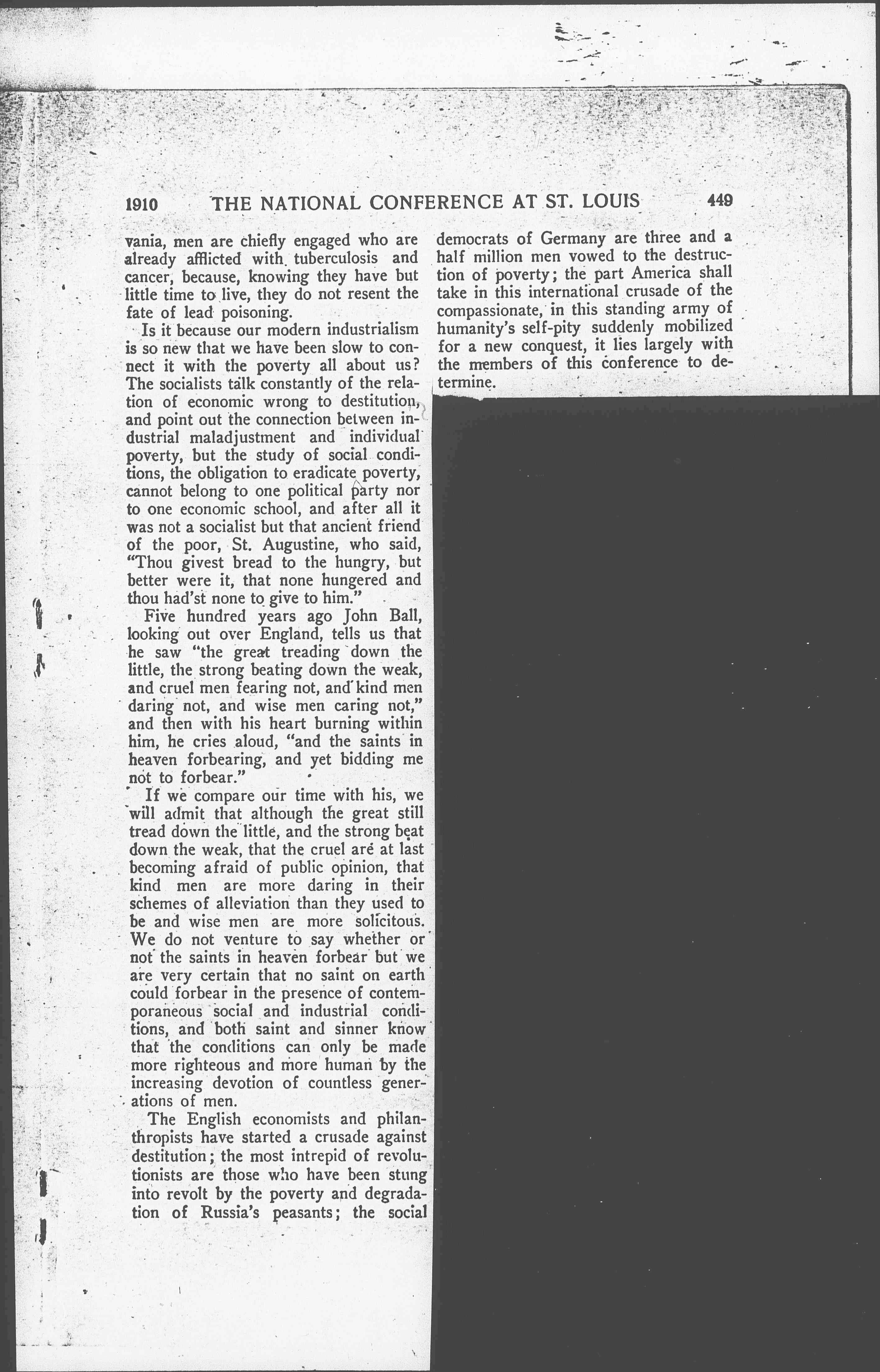 Is it because our modern industrialism is so new that we have been slow to connect it with the poverty all about us? The socialists talk constantly of the relation of economic wrong to destitution, and point out the connection between industrial maladjustment and individual poverty, but the study of social conditions, the obligation to eradicate poverty, cannot belong to one political party nor to one economic school, and after all it was not a socialist but that ancient friend of the poor, St. Augustine, who said, "Thou givest bread to the hungry, but better were it, that none hungered and thou had'st none to give to him." Five hundred years ago John Ball, looking out over England, tells us that he saw "the great treading down the little, the strong beating down the weak, and cruel men fearing not, and kind men daring not, and wise men caring not," and then with his heart burning within him, he cries aloud, "and the saints in heaven forbearing, and yet bidding me not to forbear."