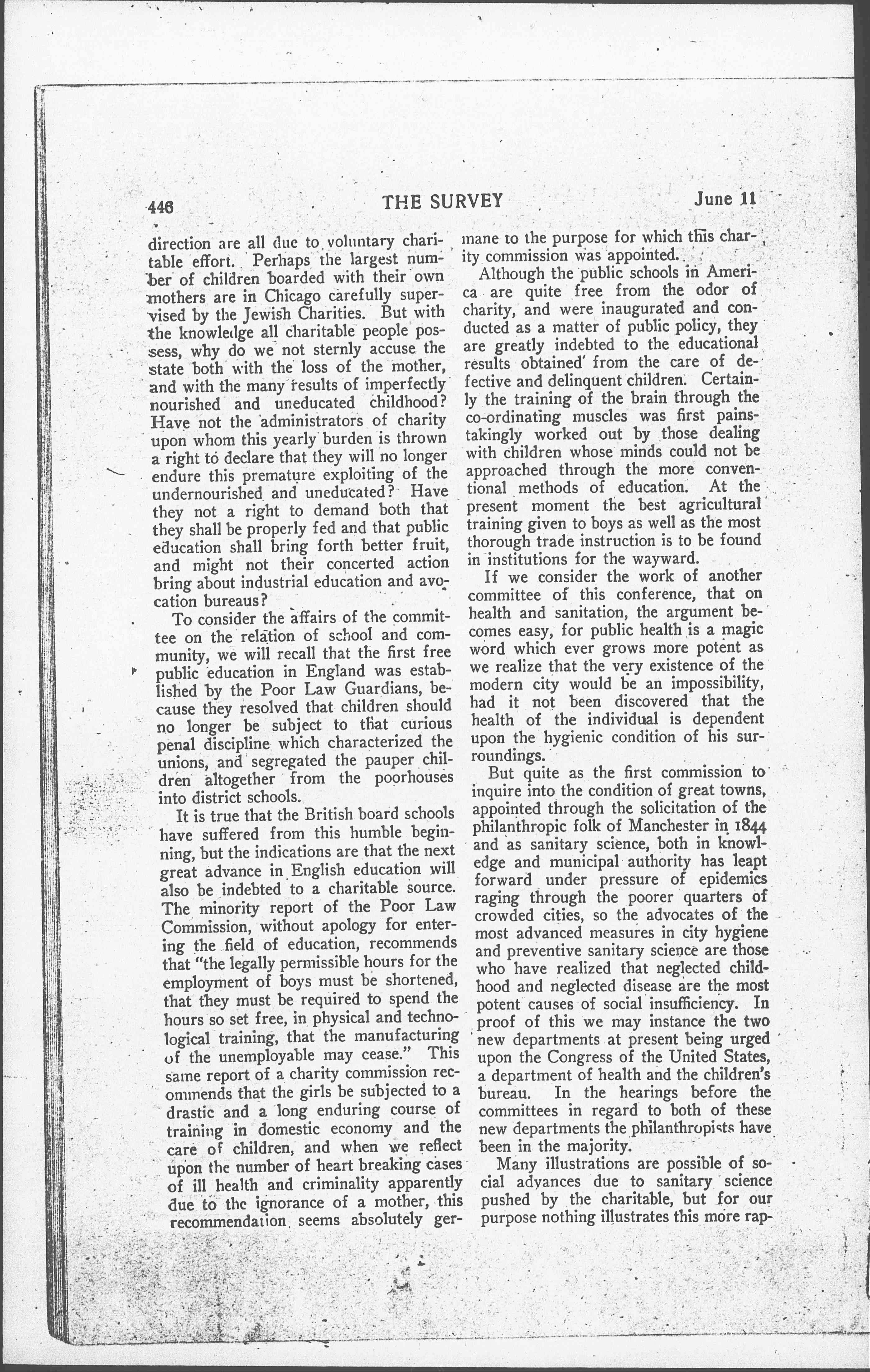 But quite as the first commission to inquire into the condition of great towns, appointed through the solicitation of the philanthropic folk of Manchester in 1844 and as sanitary science, both in knowledge and municipal authority has leapt forward under pressure of epidemics raging through the poorer quarters of crowded cities, so the advocates of the most advanced measures in city hygiene and preventive sanitary science, both in knowledge and municipal authority has leapt forward under pressure of epidemics raging through the poorer quarters of crowded cities, so the advocates of the most advanced measures in city hygiene and preventive sanitary science are those who have realized that neglected childhood and neglected disease are the most potent causes of social insufficiency. In proof of this we may instance the two new departments at present being urged upon the Congress of the United States, a department of health and the children's bureau. In the hearings before the committees in regard to both of these new departments the philanthropists have been in the majority.