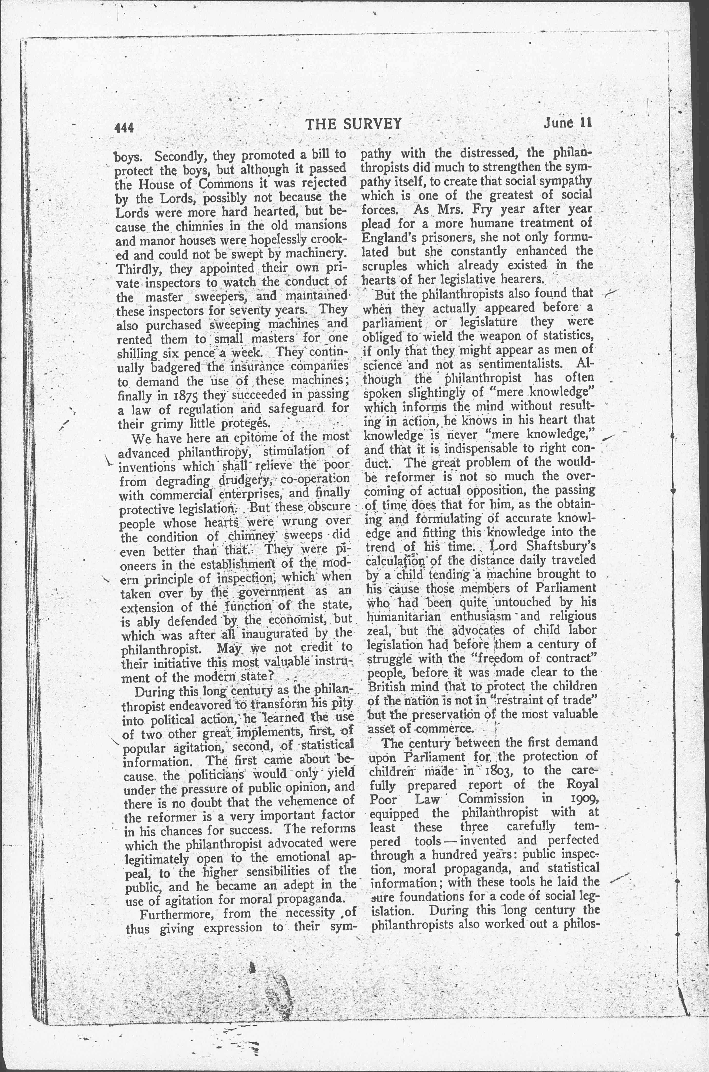 To begin with the most important: How far have the philanthropic contributed to the formation of the modern state, not because they would stifle their own personal sentiments of pity and justice, but because they realized how inadequate these were unless they could find expression as an integral branch of corporate government. Through a century, therefore, in anticipation of coming changes which does so much to bring changes about, the philanthropists have been steadily engaged in making a new state. We may concretely illustrate this pricess of state making by a century of effort in England to protect chimney sweeps, certainly a modest undertaking. The Society for Superseding the Work of Climbing Boys was founded in 1803 by some kind hearted people whose names have not been preserved. They first offered a prize of two hundred pounds for the best sweeping machine which should obviate the necessity for [page 4] boys. Secondly, they promoted a bill to protect the boys, but although it passed the House of Commons it was rejected by the Lords, possibly not because the Lords were more hard hearted, but because the chimnies in the old mansions and manor houses were hopelessly crooked and could not be swept by machinery. Thirdly, they appointed their own private inspectors for seventy years. They also purchased sweeping machines and rented them to small masters for one shilling six pence a week. They continually badgered the insurance companies to demand the use of these machines; finally in 1875 they succeeded in passing a law of regulation and safehuard for their grimy little proteges.