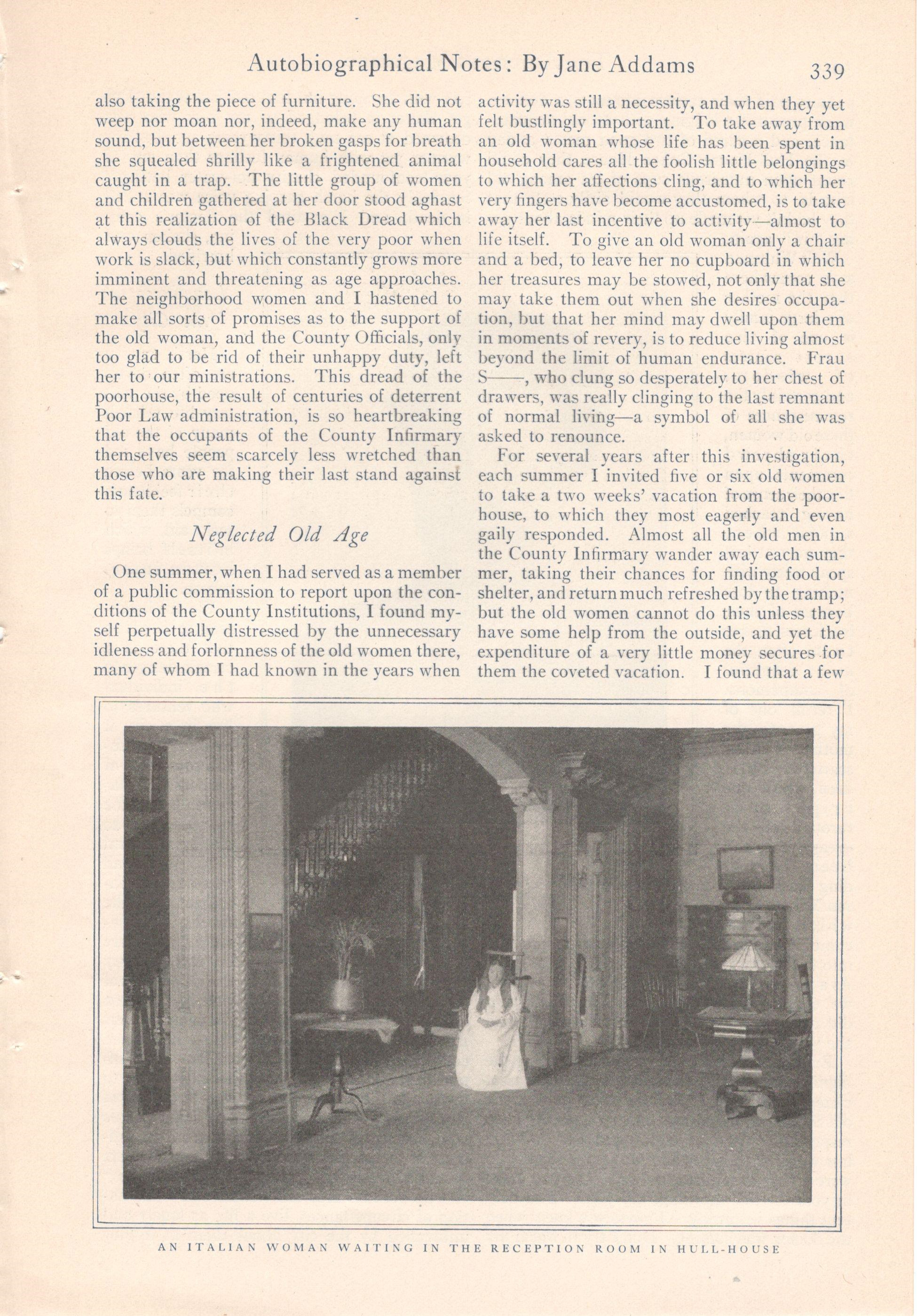 For several years after this investigation, each summer I invited five or six old women to take a two weeks' vacation from the poorhouse, to which they most eagerly and even gaily responded. Almost all the old men in the County Infirmary wander away each summer, taking their chances for finding food or shelter, and return much refreshed by the tramp; but the old women cannot do this unless they have some help from the outside, and yet the expenditure of a very little money secures for them the coveted vacation. I found that a few [image AN ITALIAN WOMAN WAITING IN THE RECEPTION ROOM IN HULL-HOUSE] [page 3] pennies paid their carfare into town, a dollar a week procured a lodging with an old acquaintance, and assured of two good meals a day in the Hull-House Coffee House, they could count upon numerous cups of tea among old friends, to whom they would airily state that they hadn't yet made up their minds about going "in" again.