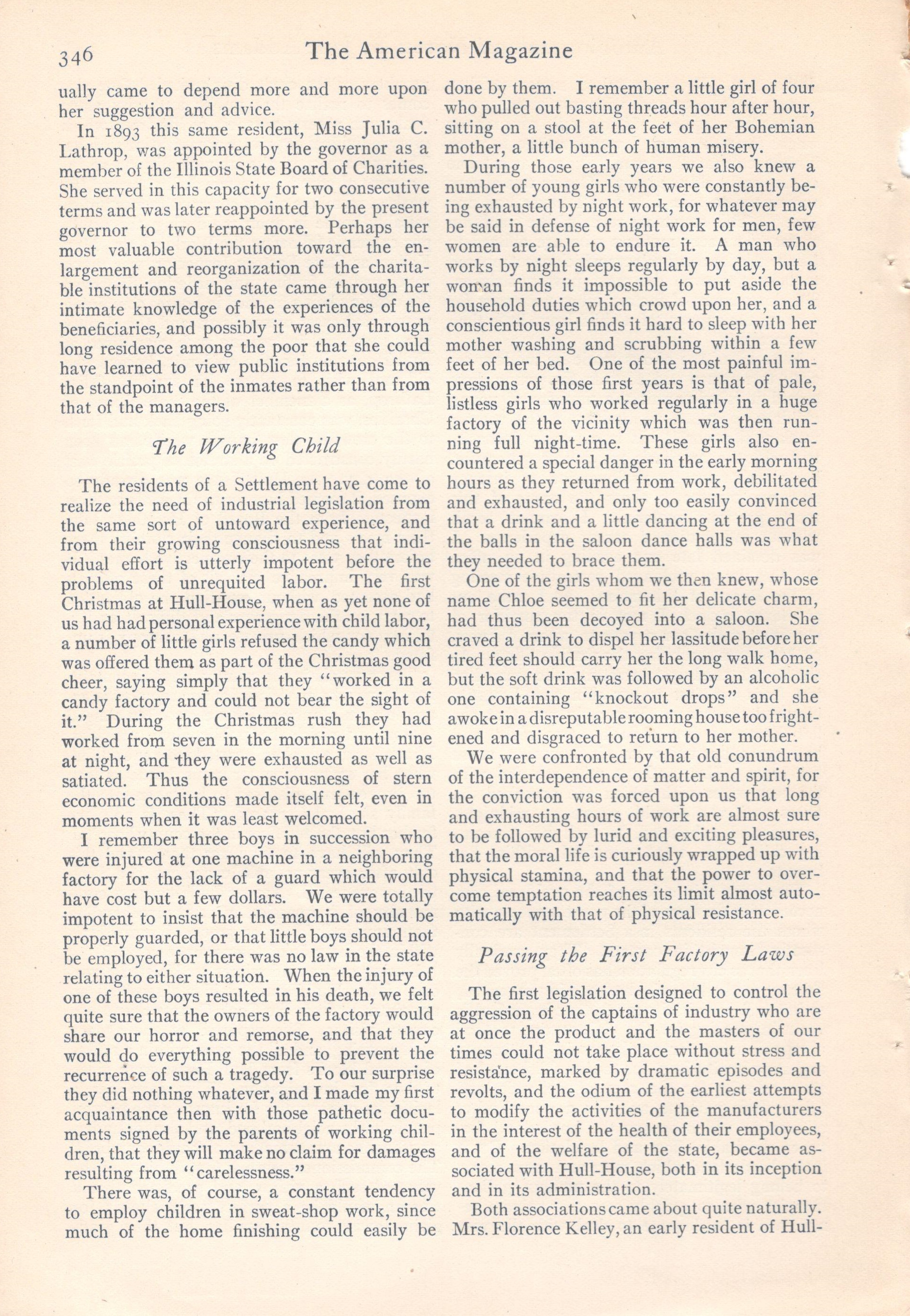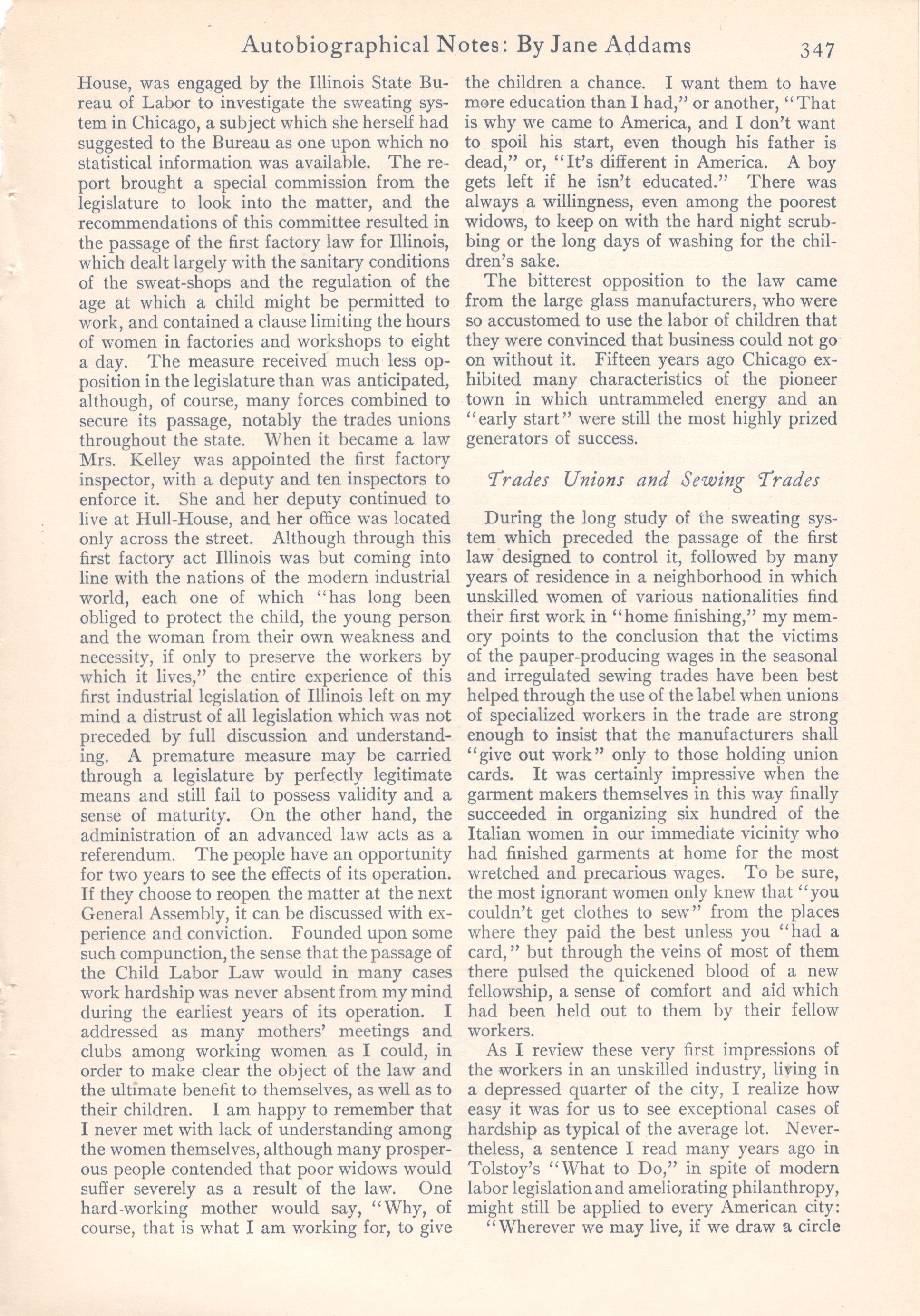 Both associations came about quite naturally. Mrs. Florence Kelley, an early resident of Hull-House [page 11] was engaged by the Illinois State Bureau of Labor to investigate the sweating system in Chicago, a subject which she herself had suggested to the Bureau as one upon which no statistical information was available. The report brought a special commission from the legislature to look into the matter, and the recommendations of this committee resulted in the passage of the first factory law for Illinois, which dealt largely with the sanitary conditions of the sweat-shop and the regulation of the age at which a child might be permitted to work, and contained a clause limiting the hours of women in factories and workshops to eight a day. The measure received much less opposition in the legislature than was anticipated, although, of course, many forces combined to secure its passage, notably the trades unions throughout the state. When it became a law Mrs. Kelley was appointed the first factory inspector, with a deputy and ten inspectors to enforce it. She and her deputy continued to live at Hull-House, and her office was located only across the street. Although through this first factory act Illinois was but coming into line with the nations of the modern industrial world, each one of which "has long been obliged to protect the child, the young person and the woman from their own weakness and necessity, if only to preserve the workers by which it lives," the entire experience of this first industrial legislation of Illinois left on my mind a distrust of all legislation which was not preceded by full discussion and understanding. A premature measure may be carried through a legislature by perfectly legitimate means and still fail to possess validity and a sense of maturity. On the other hand, the administration of an advanced law acts as a referendum. The people have an opportunity for two years to see the effects of its operation. If they choose to reopen the matter at the next General Assembly, it can be discussed with experience and conviction. Founded upon some such compunction, the sense that the passage of the Child Labor Law would in many cases work hardship was never absent from my mind during the earliest years of its operation. I addressed as many mother's meetings and clubs among working women as I could, in order to make clear the object of the law and the ultimate benefit to themselves, as well as to their children. I am happy to remember that I never met with lack of understanding among the women themselves, although many prosperous people contended that poor widows would suffer severely as a result of the law. One hard-working mother would say, "Why, of course, that is what I am working for, to give the children a chance. I want them to have more education than I had," or another, "That is why we came to America, and I don't want to spoil his start, even though his father is dead," or, "It's different in America. A boy gets left if he isn't educated." There was always a willingness, even among the poorest widows, to keep on with the hard night scrubbing or the long days of washing for the children's sake.