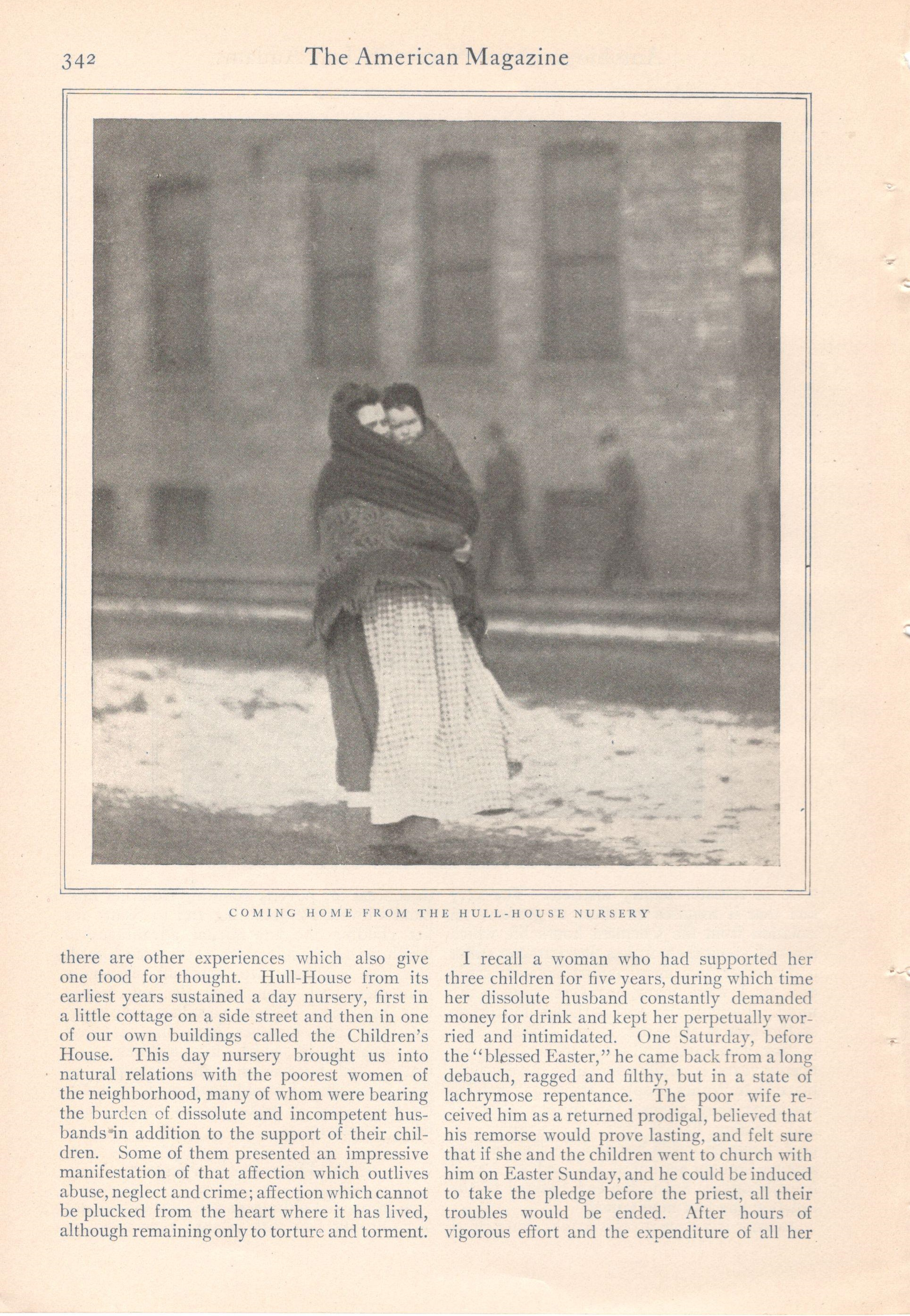As neglected old age and the loneliness born of pride fills one with strange reflections, so [page 5] [image COMING HOME FROM THE HULL-HOUSE NURSERY] there are other experiences which also give one food for thought. Hull-House from its earliest years sustained a day nursery, first in a little cottage on a side street and then in one of our own buildings called the Children's House. This day nursery brought us into natural relations with the poorest women of the neighborhood, many of whom were bearing the burden of dissolute and incompetent husbands in addition to the support of their children. Some of them presented an impressive manifestation of that affection which outlives abuse, neglect and crime; affection which cannot be plucked from the heart where it has lived, although remaining only to torture and torment.
