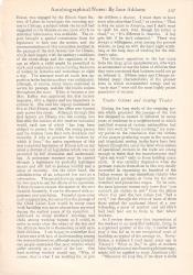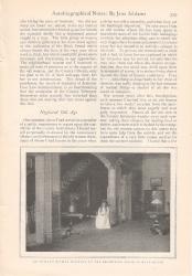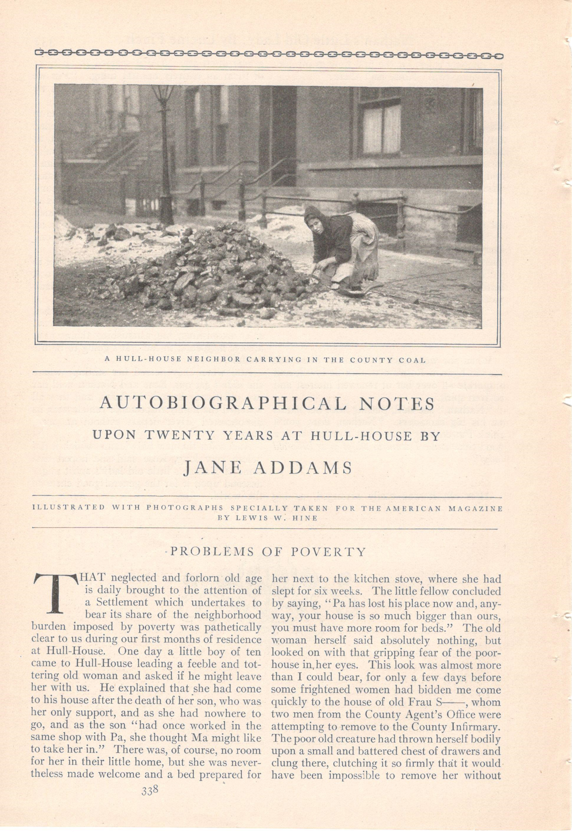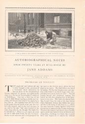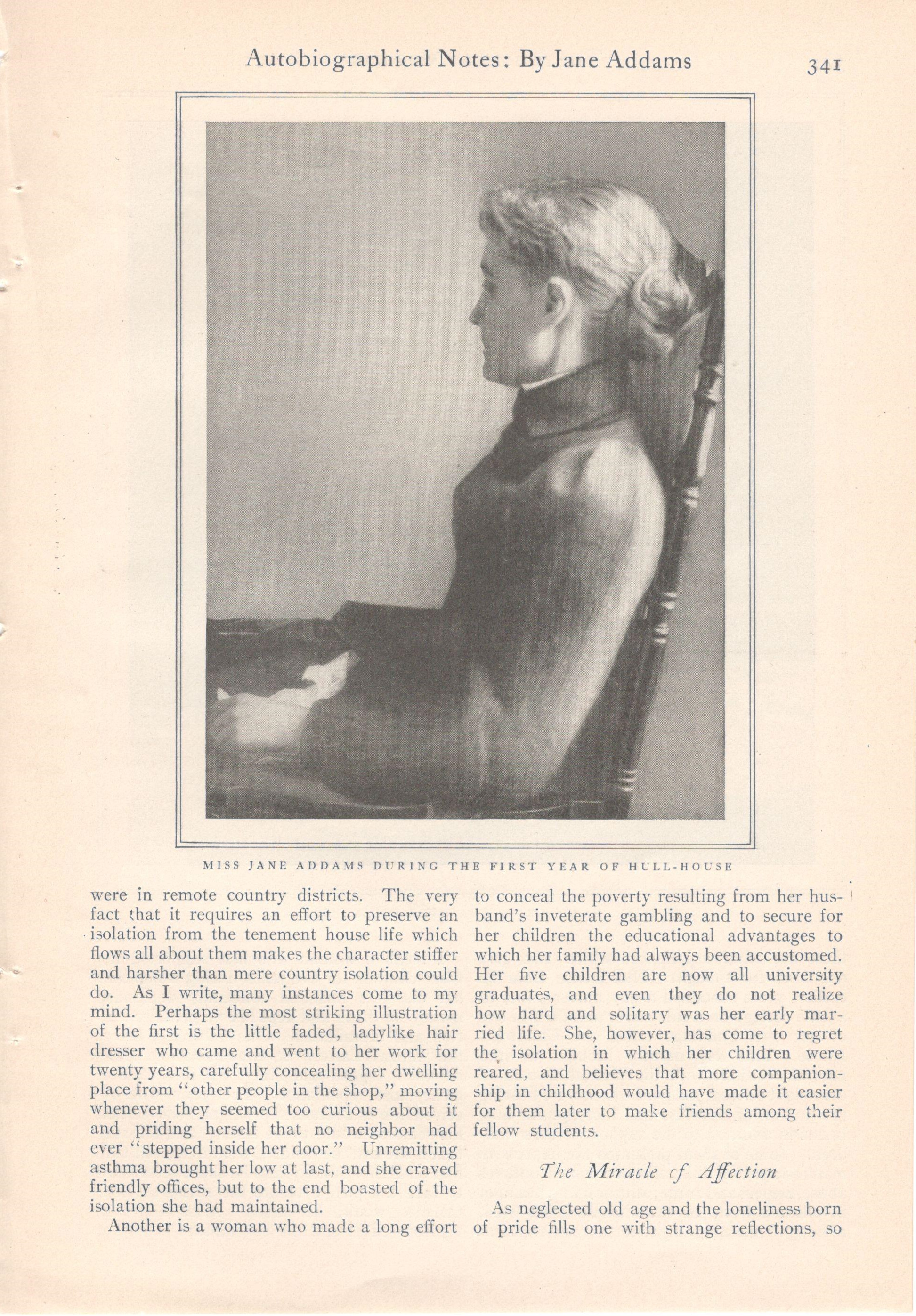 We are beginning to realize that there is a certain danger to the individual who ventures to live in a city if he fails to establish some sort of genuine relationship with the people who so closely surround him. We are all more or less familiar with the results of isolation in rural districts. The Bronte sisters have portrayed the hideous immortality and savagery of the remote dwellers on the bleak moorlands of northern England, Miss Wilkins has written of the over-developed will of the solitary New Englander, but the tales still wait to be written concerning the isolated city dweller. In addition to the lonely young man recently come to town, and the country family who have not yet made their connection, are many other people who, because of temperament, or from an estimate of themselves which will not permit them to make friends with the "people around here," or who because they are victims of a combination of circumstances, live a life as lonely and untouched by the city about them as if they [page 4] [image MISS JANE ADDAMS DURING THE FIRST YEAR OF HULL-HOUSE] were in the remote country districts. The very fact that it requires an effort to preserve an isolation from the tenement house life which flows all about them makes the character stiffer and harsher than mere country isolation could do. As I write, many instances come to my mind. Perhaps the most striking illustration of the first is the little faded, ladylike hair dresser who came and went to her work for twenty years, carefully concealing her dwelling place from "other people in the shop," moving whenever they seemed too curious about it and priding herself that no neighbor had ever "stepped inside her door." Unremitting asthma brought her low at last, and she craved friendly offices, but to the end boasted of the isolation she had maintained.