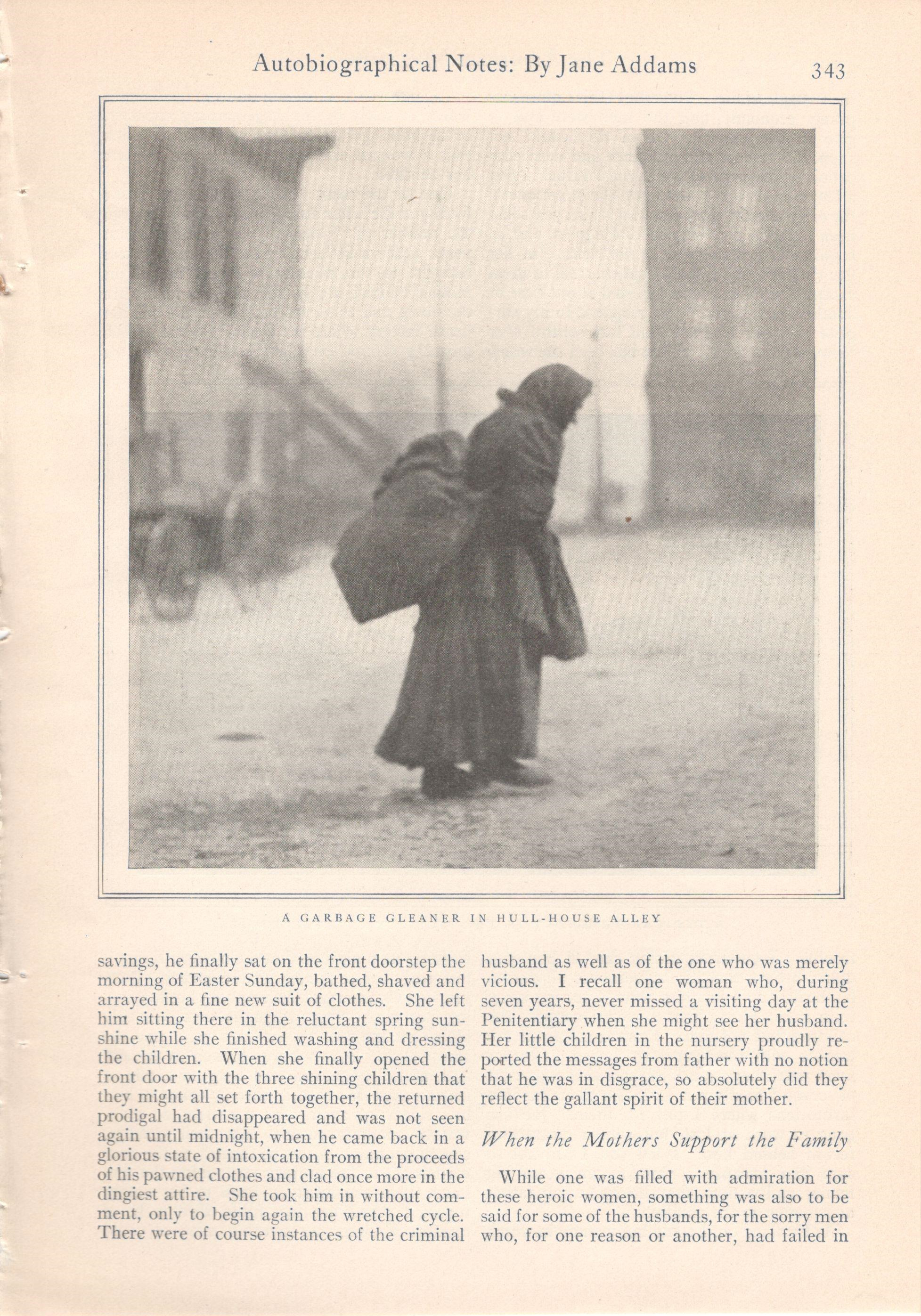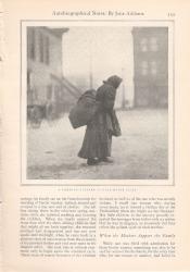 I recall a woman who had supported her three children for five years, during which time her dissolute husband constantly demanded money for drink and kept her perpetually worried and intimidated. One Saturday, before the "blessed Easter," he came back from a long debauch, ragged and filthy, but in a state of lachrymose repentance. The poor wife received him as a returned prodigal, believed that his remorse would prove lasting, and felt sure that if she and the children went to church with him on Easter Sunday, and he could be induced to take the pledge before the priest, all their troubles would be ended. After hours of vigorous effort and the expenditure of all her [page 6] [image A CABBAGE GLEANER IN HULL-HOUSE ALLEY] savings, he finally sat on the front doorstep the morning of Easter Sunday, bathed, shaved and arrayed in a fine new suit of clothes. She left him sitting there in the reluctant spring sunshine while she finished washing and dressing the children. When she finally opened the front door with the three shining children that they might all set forth together, the returned prodigal had disappeared and was not seen again until midnight, when he came back in a glorious state of intoxication from the proceeds of his pawned clothes and clad once more in the dingiest attire. She took him in without comment, only to begin again the wretched cycle. There were of course instances of the criminal husband as well as of the one who was merely vicious. I recall one woman who, during seven years, never missed a visiting day at the Penitentiary when she might see her husband. Her little children in the nursery proudly reported the messages from father with no notion that he was in disgrace, so absolutely did they reflect the gallant spirit of their mother.