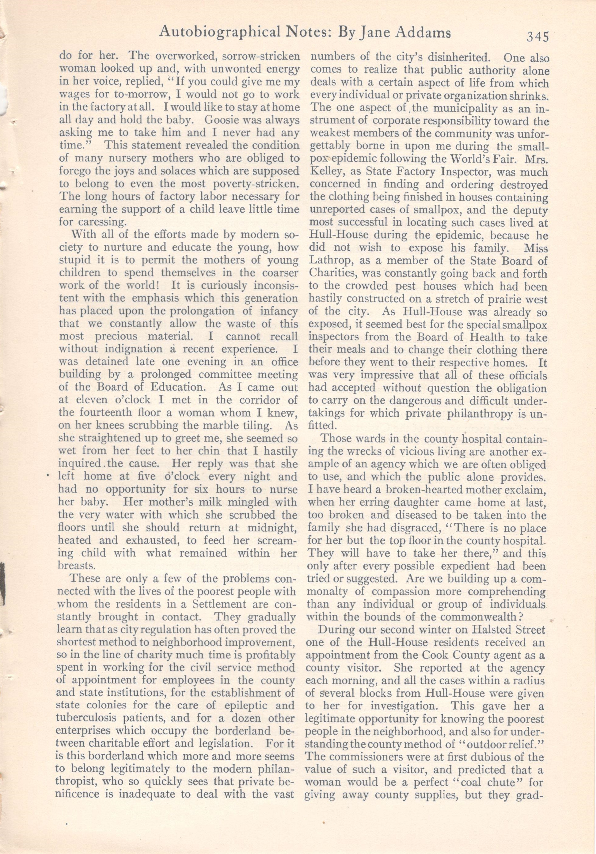 During our second winter on Halsted Street one of the Hull-House residents received an appointment from the Cook County agent as a county visitor. She reported at the agency each morning, and all the cases within a radius of several blocks from Hull-House were given to her for investigation. This gave her a legitimate opportunity for knowing the poorest people in the neighborhood, and also for understanding the county method of "outdoor relief." The commissioners were at first dubious of the value of such a visitor, and predicted that a woman would be a perfect "coal chute" for giving away county supplies, but they gradually [page 10] came to depend more and more upon her suggestion and advice.