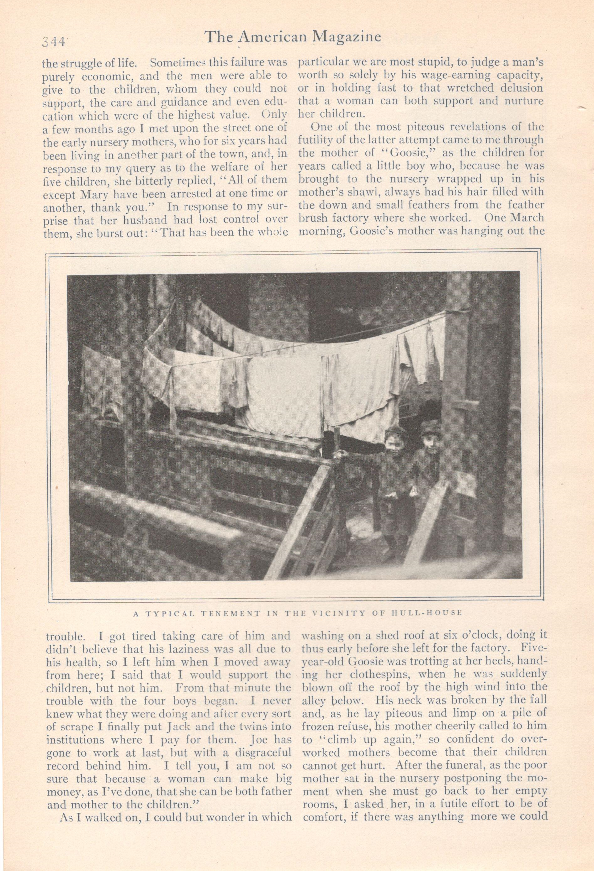 While one was filled with admiration for these heroic women, something was also to be said for some of the husbands, for the sorry men who, for one reason or another, had failed in [page 7] the struggle of life. Sometimes this failure was purely economic, and the men were able to give to the children, whom they could not support, the care and guidance and even education which were of the highest value. Only a few months ago I met upon the street one of the early nursery mothers, who for six years had been living in another part of the town, and, in response to my query as to the welfare of her five children, she bitterly replied, "All of them except Mary have been arrested at one time or another, thank you." In response to my surprise that her husband had lost control over them, she burst out: "That has been the whole [image A TYPICAL TENEMENT IN THE VICINITY OF HULL-HOUSE] trouble. I got tired taking care of him and didn't believe that his laziness was all due to his health, so I left him when I moved away from here; I said that I would support the children, but not him. From that minute the trouble with the four boys began. I never knew what they were doing and after every sort of scrape I finally put Jack and the twins into institutions where I pay for them. Joe has gone to work at last, but with a disgraceful record behind him. I tell you, I am not so sure that because a woman can make big money, as I've done, that she can be both father and mother to the children."