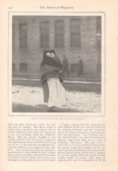 One of the most piteous revelations of the futility of the latter attempt came to me through the mother of "Goosie," as the children for years called a little boy who, because he was brought to the nursery wrapped up in his mother's shawl, always had his hair filled with the down and small feathers from the feather brush factory where she worked. One March morning, Goosie's mother was hanging out the washing on a shed roof at six o'clock, doing it thus early before she left for the factory. Five-year-old Goosie was trotting at her heels, handing her clothespins, when he was suddenly blown off the roof by the high wind into the alley below. His neck was broken by the fall and, as he lay piteous and limp on a pile of frozen refuse, his mother cheerily called to him to "climb up again," so confident do overworked mothers become that their children cannot get hurt. After the funeral, as the poor mother sat in the nursery postponing the moment when she must go back to her empty rooms, I asked her, in a futile effort to be of comfort, if there was anything more we could [page 8] do for her. The overworked, sorrow-stricken woman looked up and, with unwonted energy in her voice, replied, "If you could give me my wages for tomorrow, I would not go to work in the factory at all. I would like to stay at home all day and hold the baby. Goosie was always asking me to take him and I never had any time." This statement revealed the condition of many nursery mothers who are obliged to forego the joys and solaces which are supposed to belong to even the most poverty-stricken. The long hours of factory labor necessary for earning the support of a child leave little time for caressing.