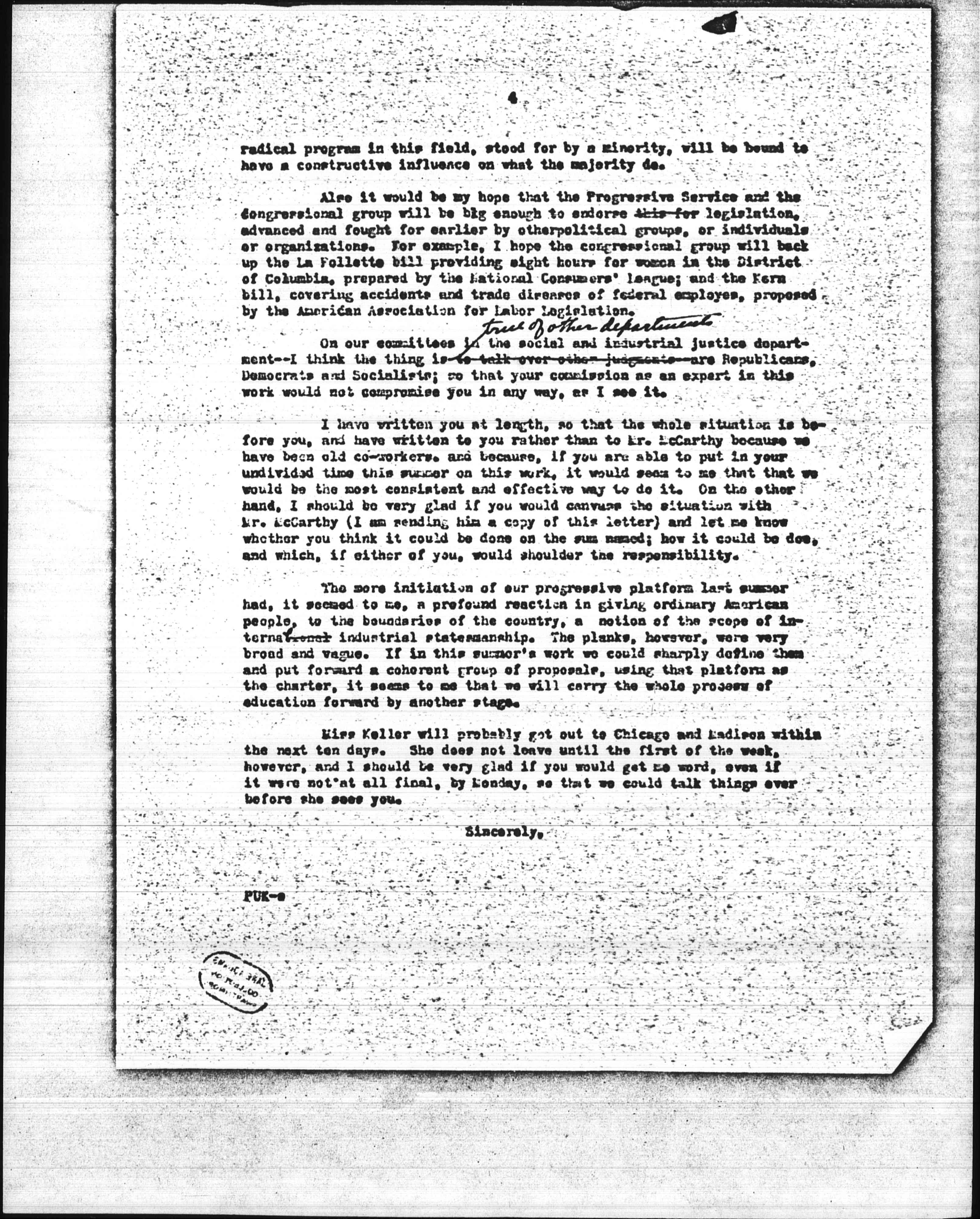 Also it would be my hope that the Progressive Service and the congressional group will be big enough to endorse this for legislation, advanced and fought for earlier by other political groups, or individuals or organizations. For example, I hope the congressional group will back up the La Follette bill providing eight hours for women in the District of Columbia, prepared by the National Consumers' league; and the Kern bill, covering accidents and trade diseases of federal [employees], proposed by the American Association for Labor Legislation.