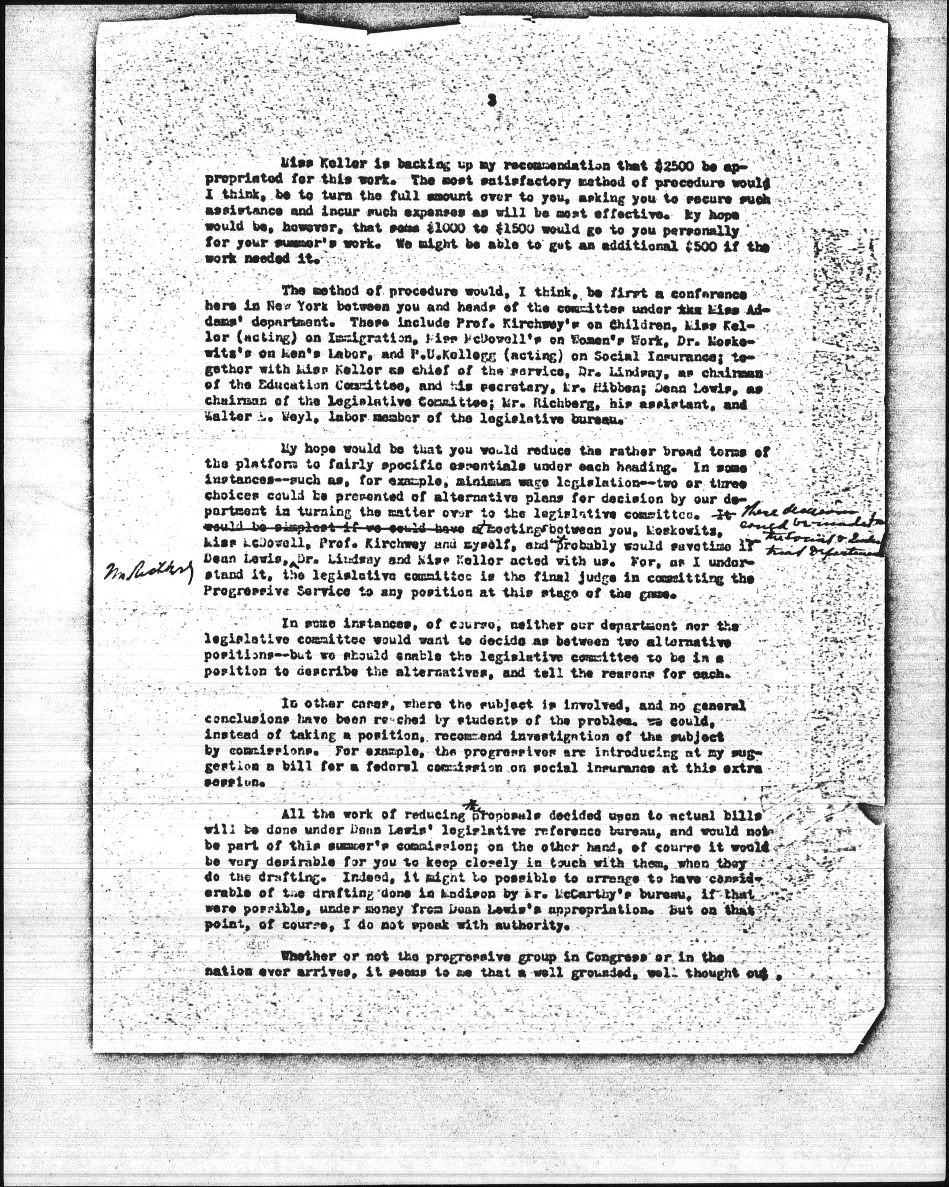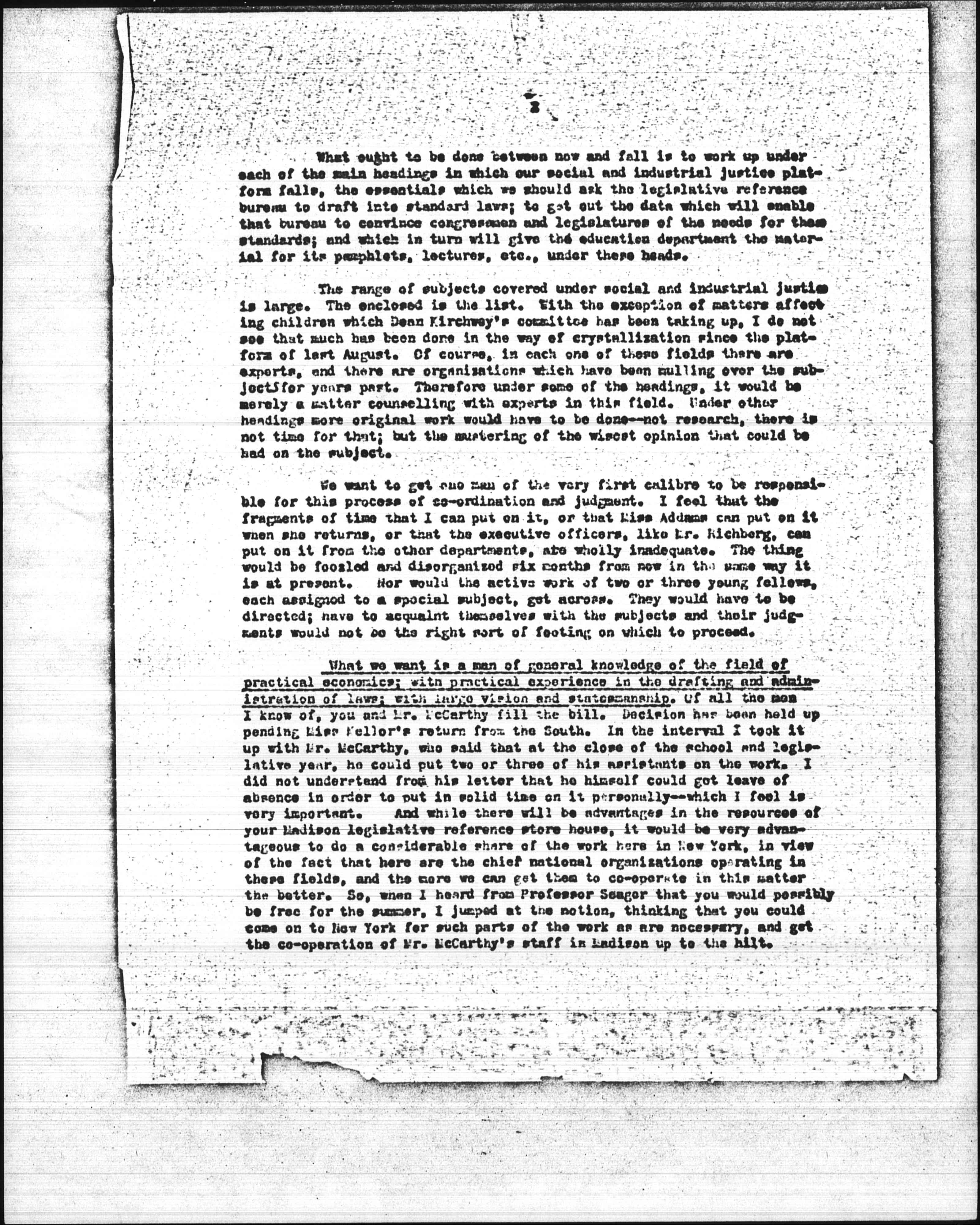 What we want is a man of general knowledge of the field of practical economics; with practical experience in the drafting and administration of laws; with large vision and statesmanship. Of all the men I know of, you and Mr. McCarthy fill the bill. Decision has been held up pending Miss Kellor's return from the South. In the interval I took it up with Mr. McCarthy, who said that at the close of the school and legislative year, he could put two or three of his assistants on the work. I did not understand from his letter that he himself could get leave of absence in order to put in solid time on it personally -- which I feel is very important. And while there will be advantages in the resources of your Madison legislative reference store house, it would be very advantageous to do a considerable share of the work here in New York, in view of the fact that here are the chief national organizations operating in these fields, and the more we can get them to [cooperate] in this matter the better. So, when I heard from Professor Seager that you would possibly be free for the summer, I jumped at the notion, thinking that you could come on to New York for such parts of the work as are necessary, and get the [cooperation] of Mr. McCarthy's staff in Madison up to the hilt. [page 3]