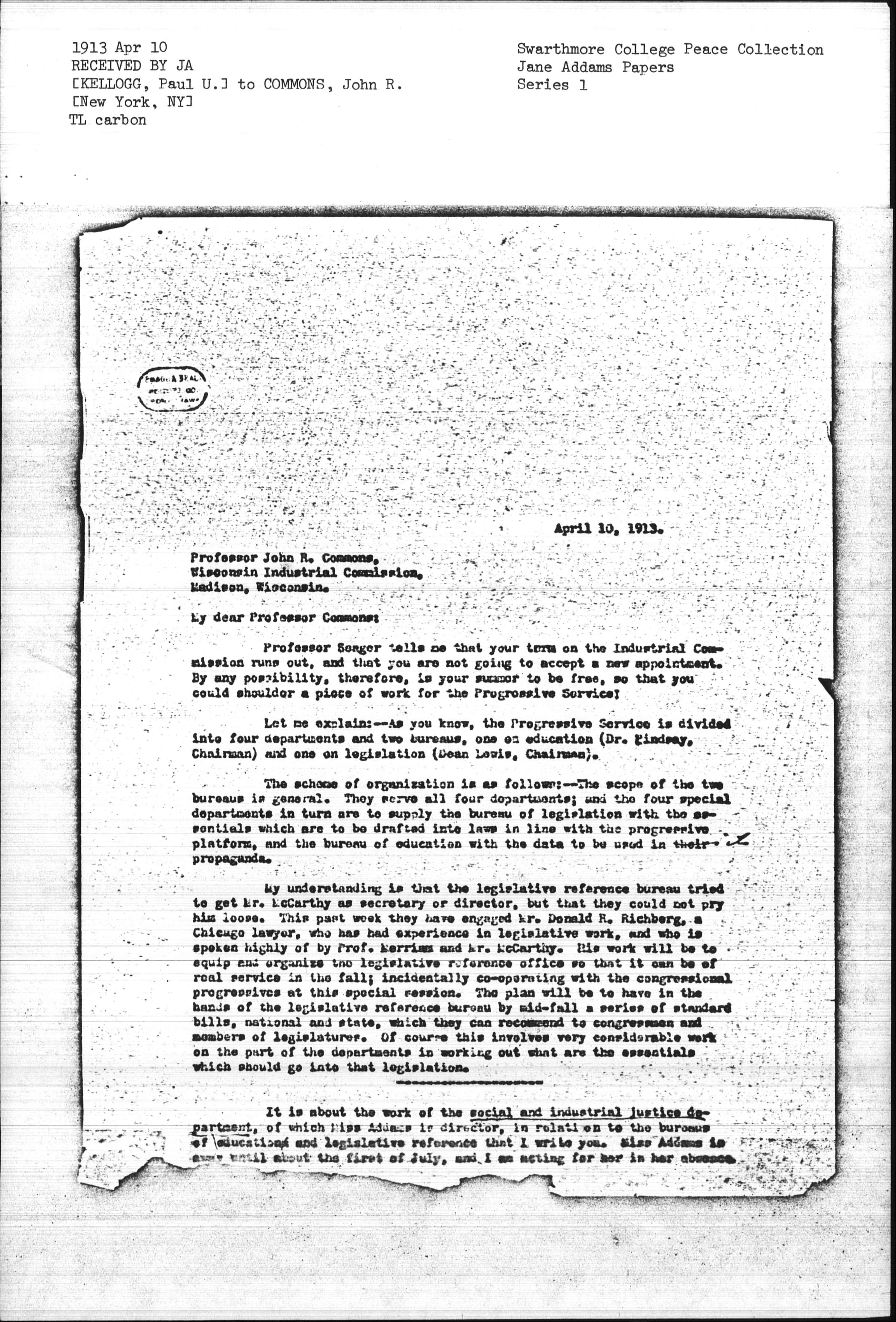 My understanding is that the legislative reference bureau tried to get Mr. McCarthy as secretary or director, but that they could not pry him loose. This past week they have engaged Mr. Donald R. Richberg, a Chicago lawyer, who has had experience in legislative work, and who is spoken highly of by Prof. Merriam and Mr. McCarthy. His work will be to equip and organize the legislative reference office so that it can be of real service in the fall; incidentally [cooperating] with the congressional progressives at this special session. The plan will be to have in the hands of the legislative reference bureau by mid-fall a series of standard bills, national and state, which they can recommend to congressmen and members of legislatures. Of course this involves very considerable work on the part of the departments in working out what are the essentials which should go into that legislation.
