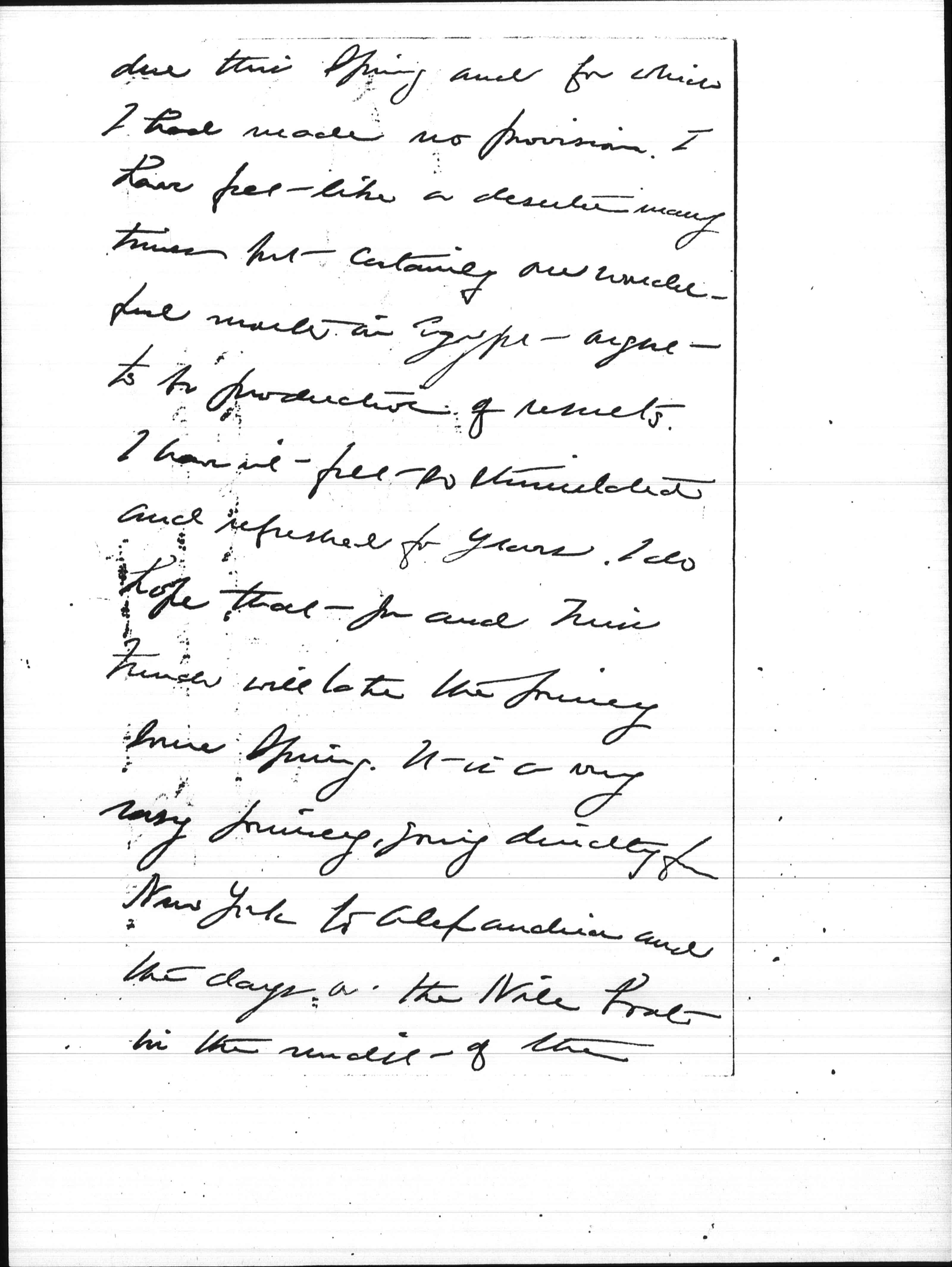 Both Mary Smith and I are profoundly touched and pleased. I had been feeling quite worried over the big insurance bills which were [page 2] due this Spring and for which I had made no provision. I have felt like a deserter many times but certainly our wonderful month in Egypt ought to be productive of results. I haven't felt so stimulated and refreshed for years. I do hope that you and Miss French will take the journey some Spring. It is a very easy journey, going directly from New York to Alexandria and the days on the Nile boat in the midst of the [page 3] careful intimate cultivation of the land, to the very waters edge, give one a new sense of human effort. The ancient history was much more vivid than I had imagined it and our letters to Judge Amos and some other English people gave us a new view of "imperialism."