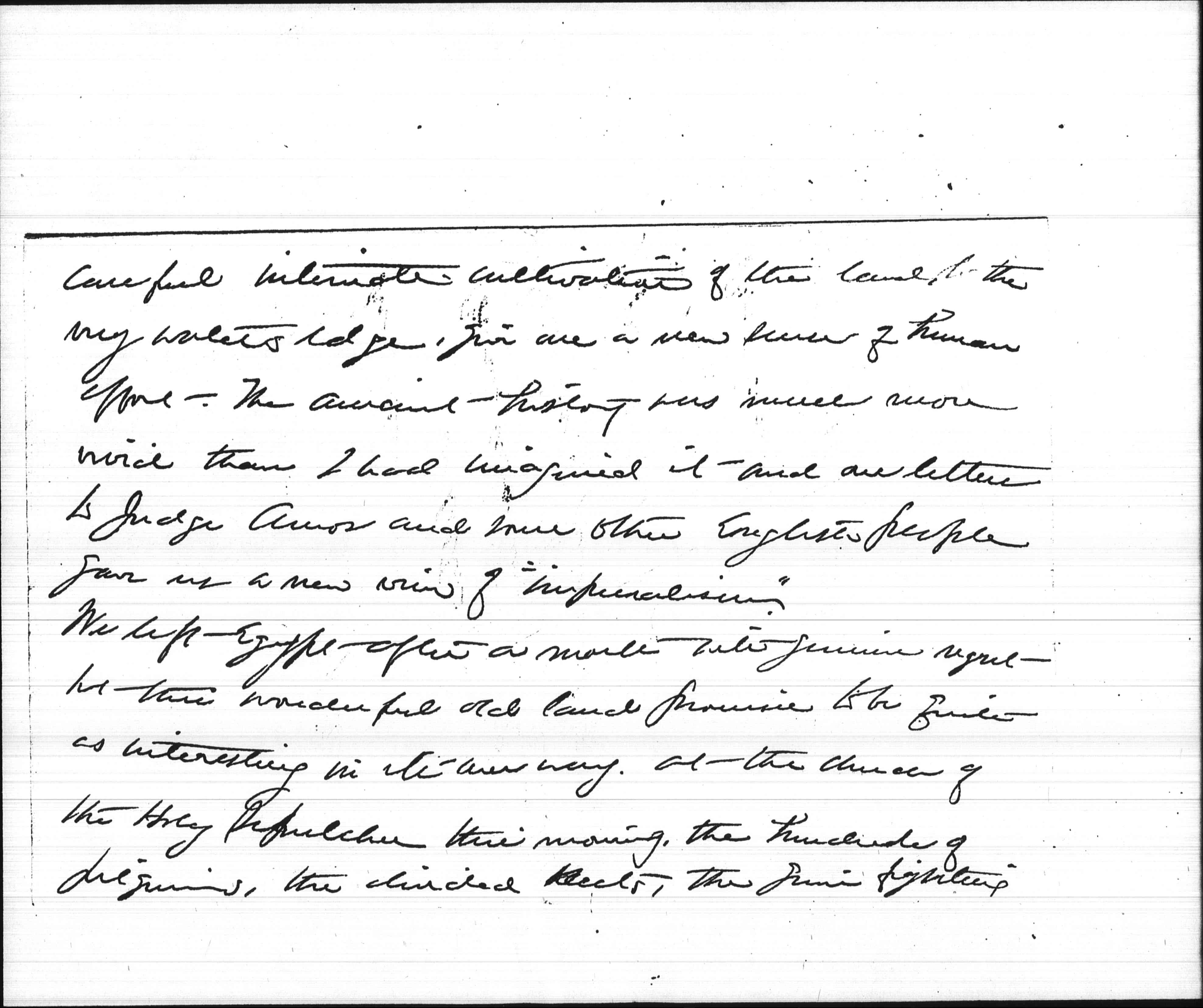 We left Egypt after a month with genuine regret but this wonderful old land promises to be quite as interesting in its own way. At the church of the Holy Sepulcher this morning, the hundreds of pilgrims, the divided sects, the grim fighting [page 4] of which it bore many traces, was very touching as if human nature had broken down [through] its very devotion to its greatest message.