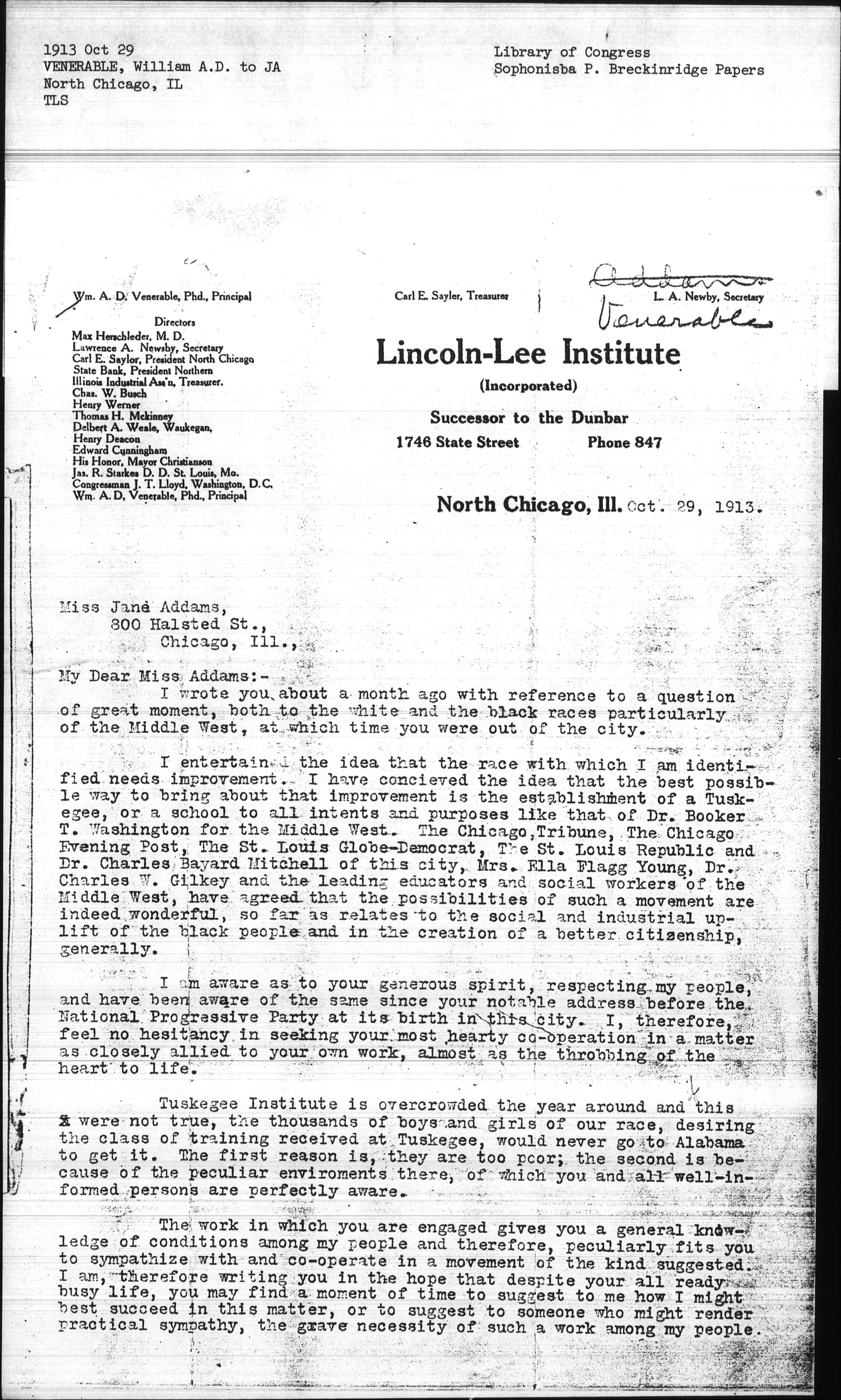 We are endeavoring to raise one hundred thousand dollars for the purchase of eighteen hundred acres of land to be devoted to the cause herein described. A prominent Chicago society lady, who prohibits the use of her name for the time being, made a tentative donation of ten thousand dollars. That is to say, when our trustee board has raised ninety thousand dollars, she will complete the hundred thousand dollars, which is necessary to accomplish the end designed. The black people have pledged a fraction over eleven thousand dollars, and our trustee board composed of prominent white men, have pledged seven thousand dollars and four thousand from other sources has been pledged. We desire to dedicate the tract of land the fifteenth of April 1914. The fifteenth of April being the day upon which our friend, the martyr Abraham Lincoln, sacrificed his life. It is our purpose to dedicate the school at its opening, September twenty-second, 1914, or the date of our emancipation. Miss Addams, as true as the sun ever shone, we will accomplish our purpose if we secure your sympathy and support.