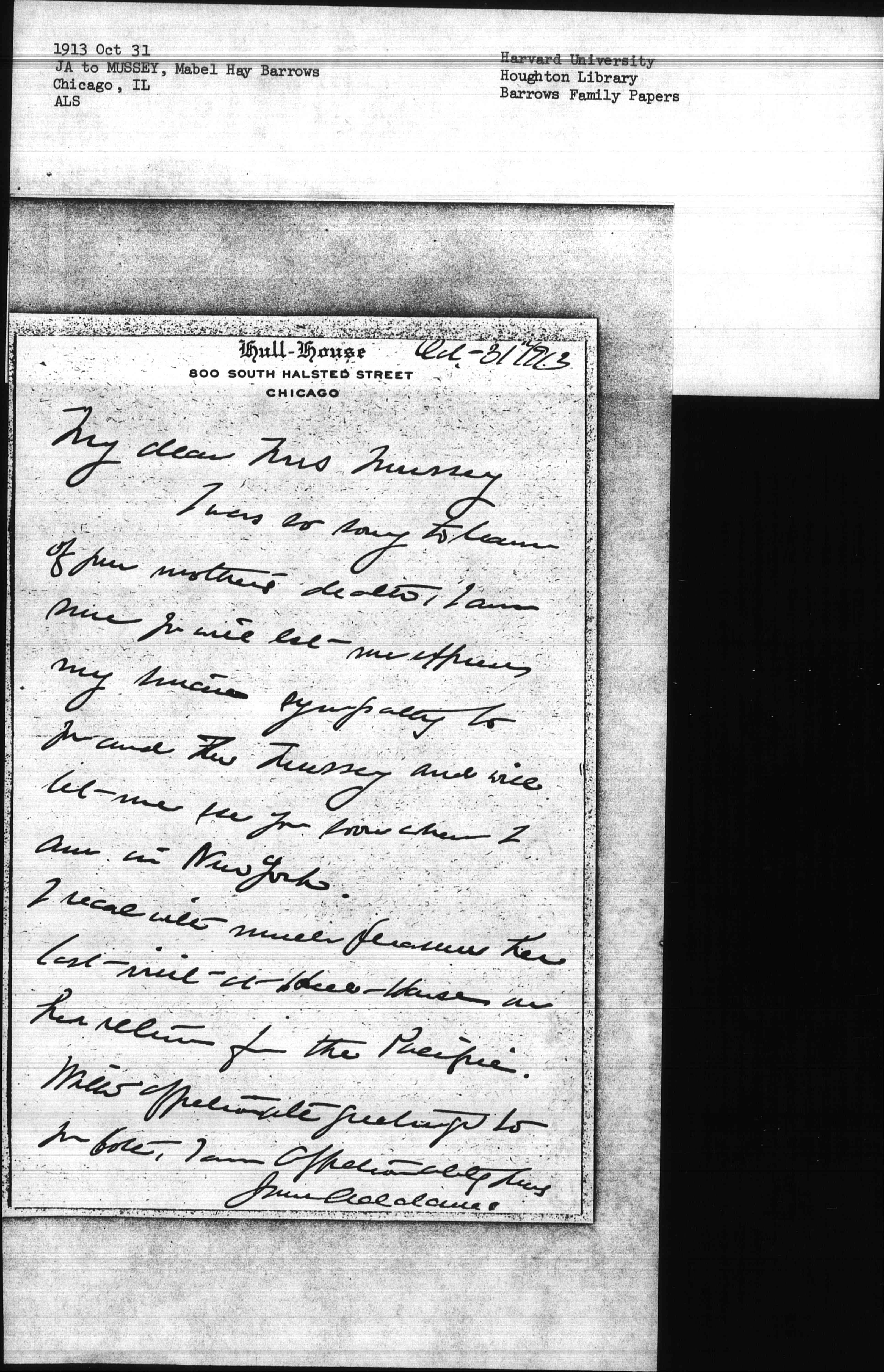 I was so sorry to learn of your mother's death, I am sure you will let me express my sincere sympathy to you and Mr Mussey and will let me see you soon when I am in New York.