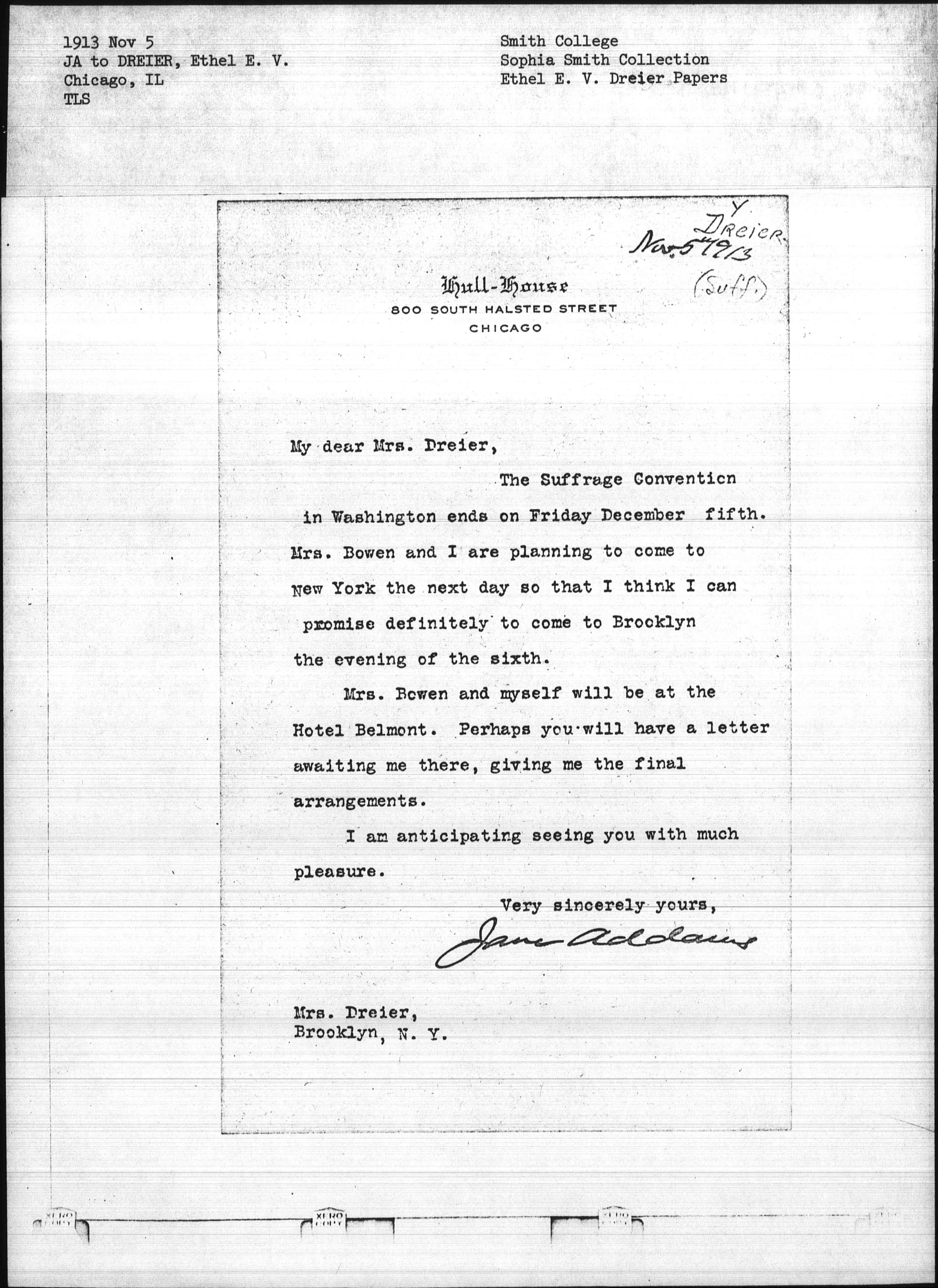 The Suffrage Convention in Washington ends on Friday December fifth. Mrs. Bowen and I are planning to come to New York the next day so that I think I can promise definitely to come to Brooklyn the evening of the sixth.
