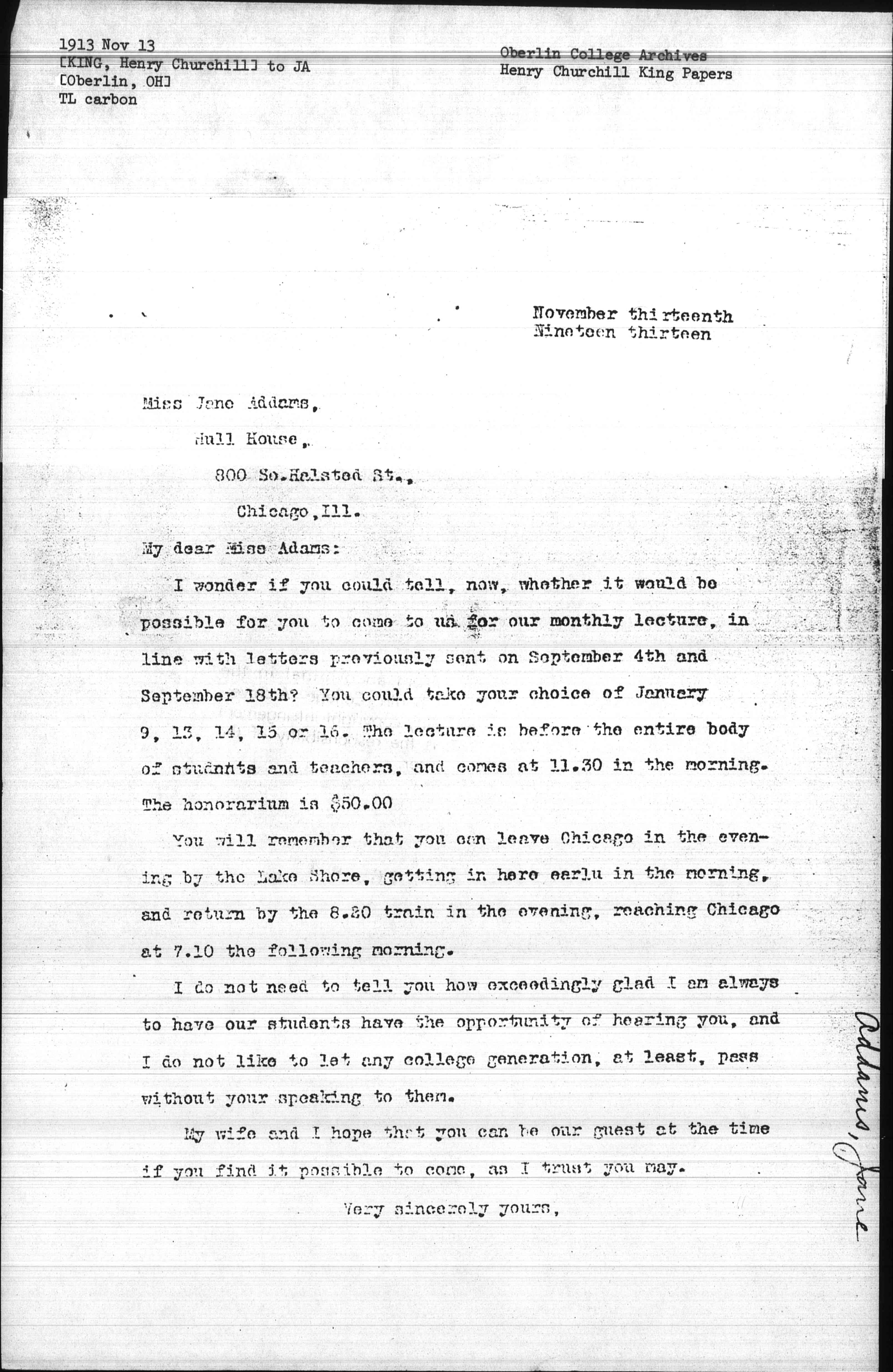 I wonder if you could tell, now, whether it would be possible for you to come to us for our monthly lecture, in line with letters previously sent on September 4th and September 18th? You could take your choice of January 9, 13, 14, 15 or 16. The lecture is before the entire body of students and teachers, and comes at 11.30 in the morning. The honorarium is $50.00.