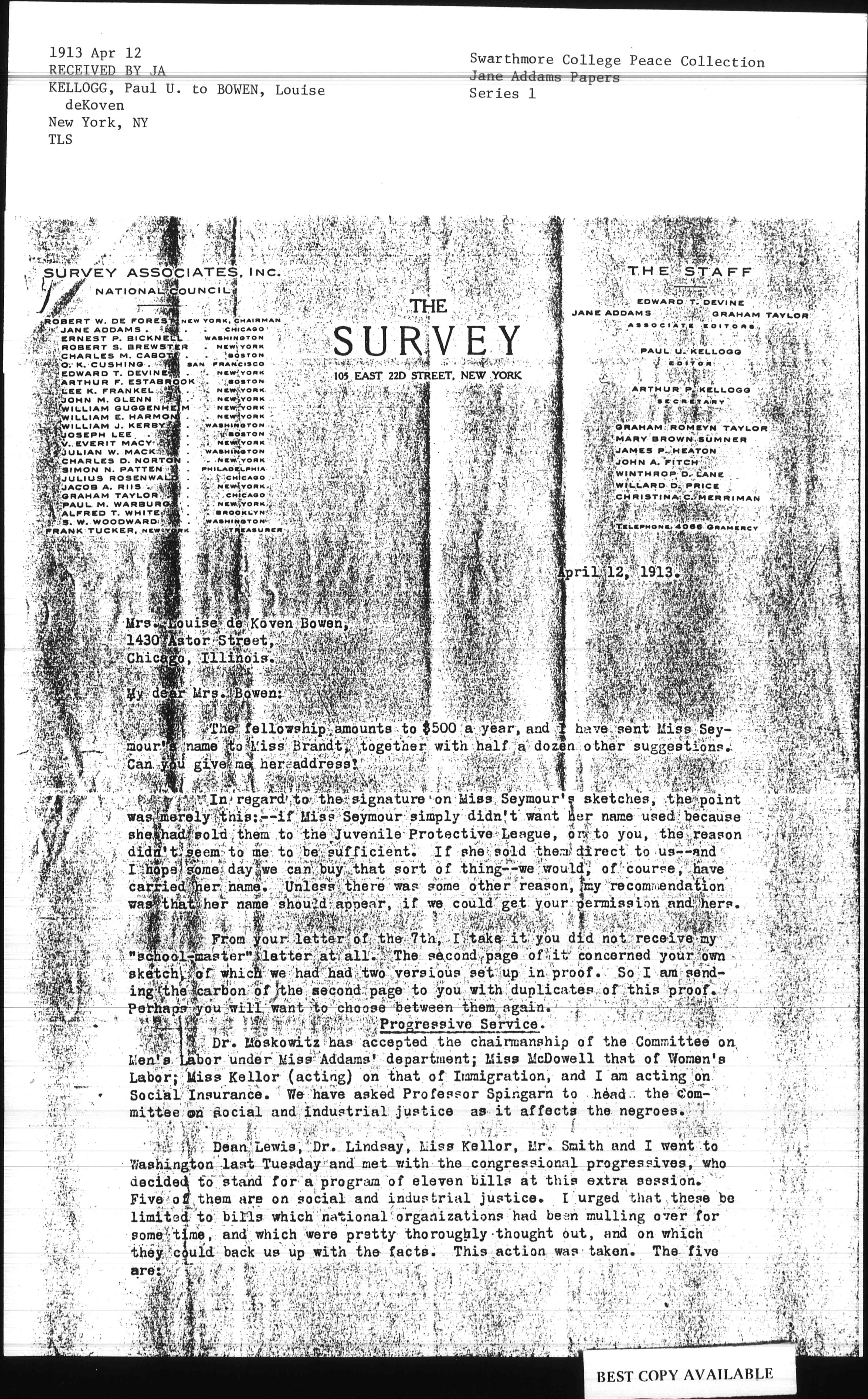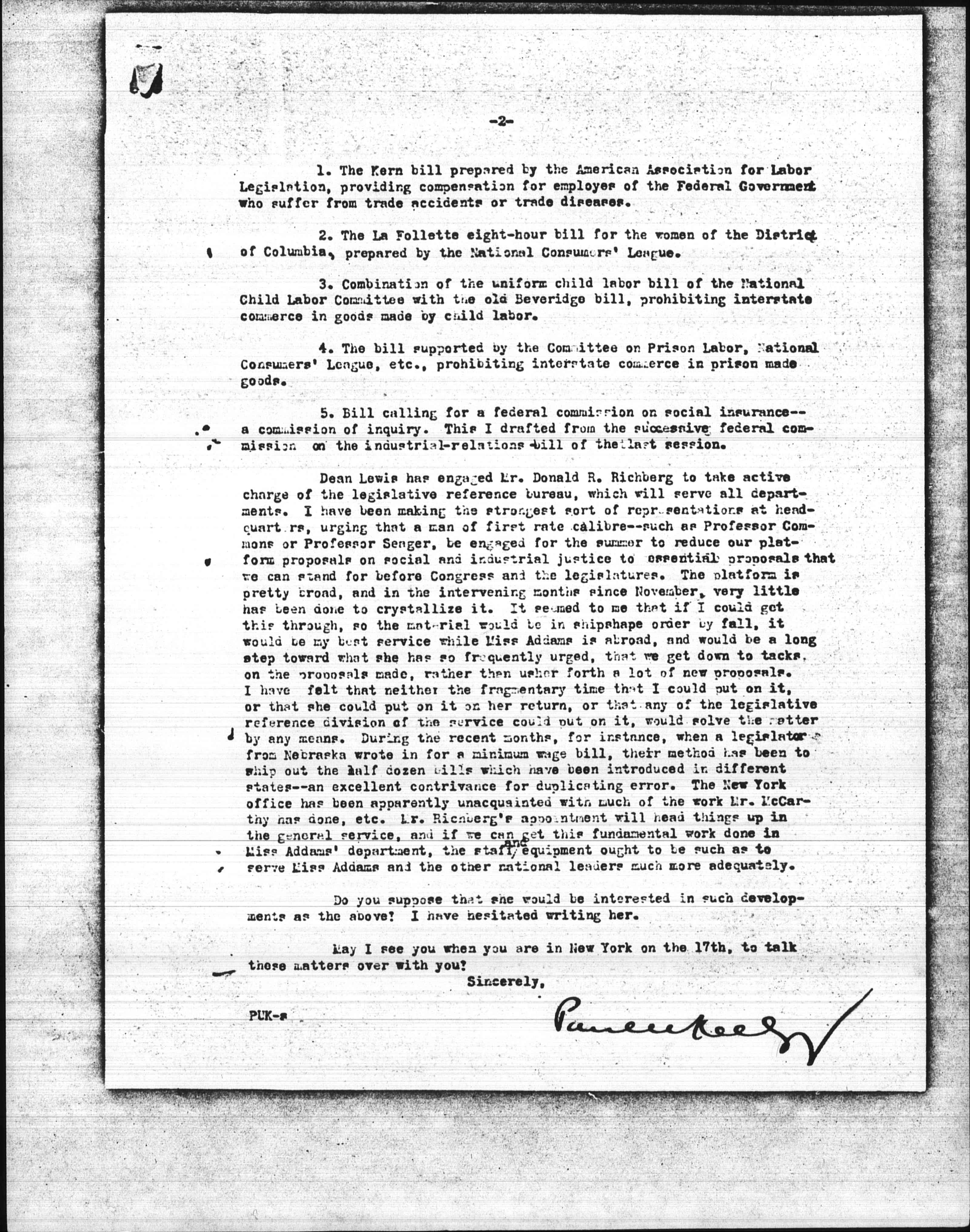 Dean Lewis has engaged Mr. Donald R. Richberg to take active charge of the legislative reference bureau, which will serve all departments. I have been making the strongest sort of representations at headquarters, urging that a man of first rate [caliber] -- such as Professor Commons or Professor Seagers, be engaged for the summer to reduce our platform proposals on social and industrial justice to essential proposals that we can stand for before Congress and the legislatures. The platform is pretty broad, and in the intervening months since November, very little has been done to crystallize it. It seemed to me that if I could get this through, so the material would be in shipshape order by fall, it would be my best service while Miss Addams is abroad, and would be a long step toward what she has so frequently urged, that we get down to tacks, on the proposals made, rather than usher forth a lot of new proposals. I have felt that neither the fragmentary time that I could put on it, or that she could put on it on her return, or that any of the legislative reference division of the service could put on it, would solve the matter by any means. During the recent months, for instance, when a legislator from Nebraska wrote in for a minimum wage bill, their method has been to whip out the half dozen bills which have been introduced in different states -- an excellent contrivance for duplicating error. The New York office has been apparently unacquainted with much of the work Mr. McCarthy has done, etc. Mr. Richberg's appointment will head things up in the general service, and if we can get this fundamental work done in Miss Addams' department, the staff <and> equipment ought to be such as to serve Miss Addams and the other national leaders much more adequately.
