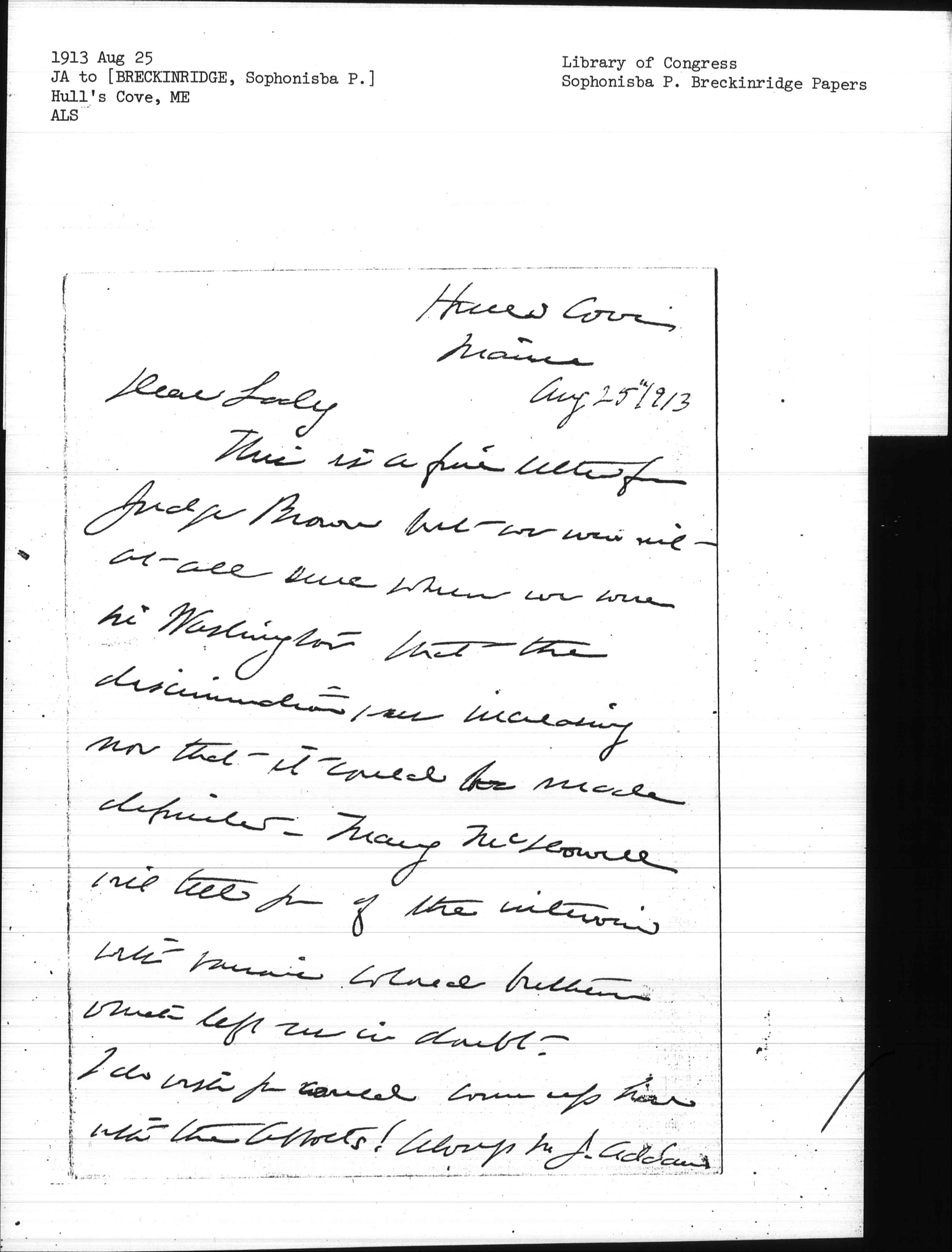 This is a fine letter from Judge Brown but we weren't at all sure when we were in Washington that the discrimination was increasing nor that it could be made definite. Mary McDowell will tell you of the interview with various colored brethren which left us in doubt.