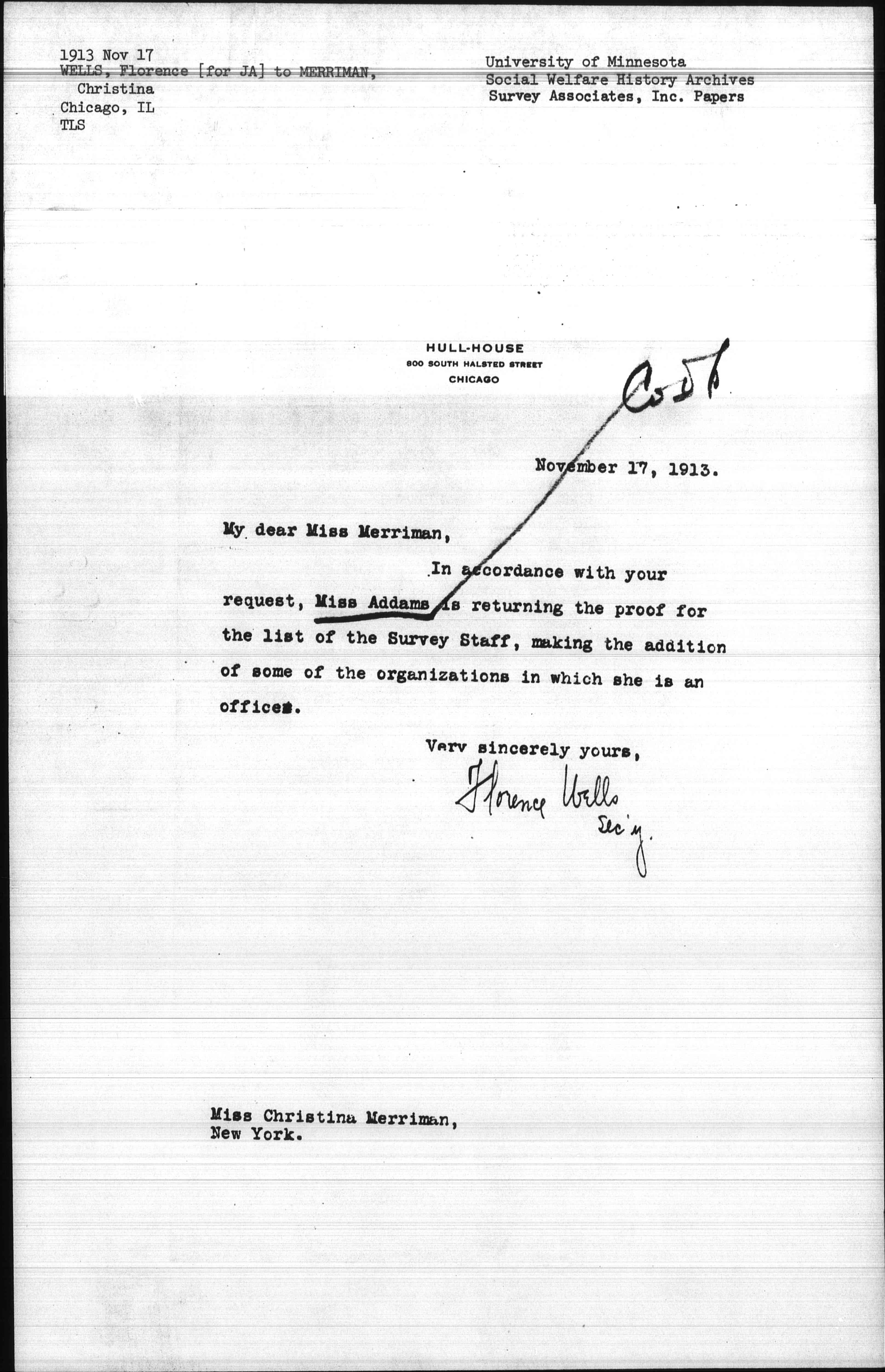 In accordance with your request, Miss Addams is returning the proof for the list of the Survey Staff, making the addition of some of the organizations in which she is an officer.