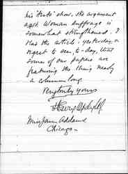 Have you not some authority on psychology, in the University of Chicago, who can get up something agst. Prof. Munsterberg's Sept. Century article? If women have the inability to concede actualities, when explained and argued, that Munsterberg claims [page 2] his "tests" show, the argument agst. woman suffrage is somewhat strengthened. I read the article, yesterday; & regret to see, [today], that some of our papers are featuring the thing nearly a column long.