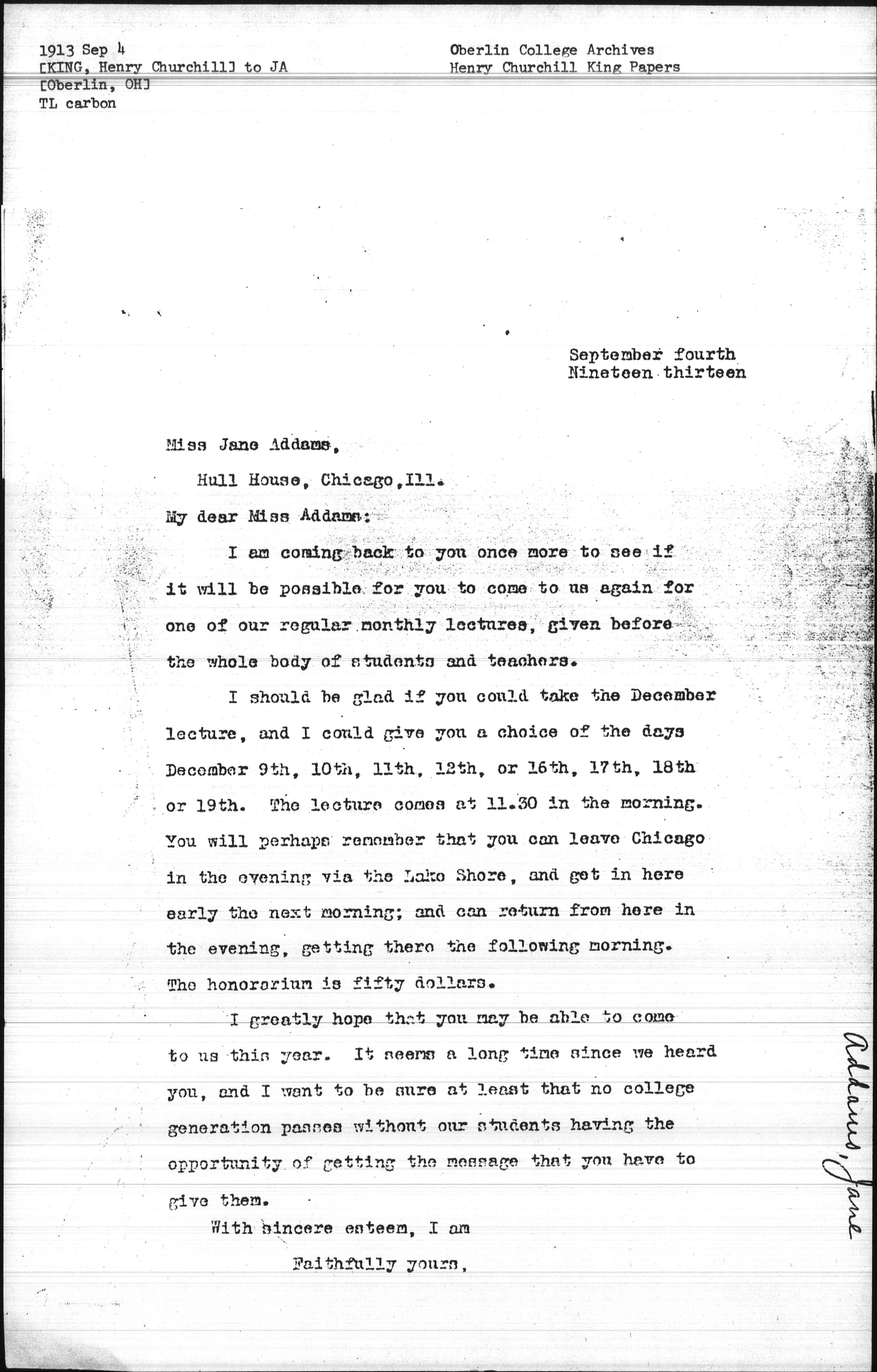 I should be glad if you could take the December lecture, and I could give you a choice of the days December 9th, 10th, 11th, 12th, or 16th, 17th, 18th or 19th. The lecture comes at 11.30 in the morning. You will perhaps remember that you can leave Chicago in the evening via the Lake Shore, and get in here early the next morning; and can return from here in the evening, getting there the following morning. The honorarium is fifty dollars.