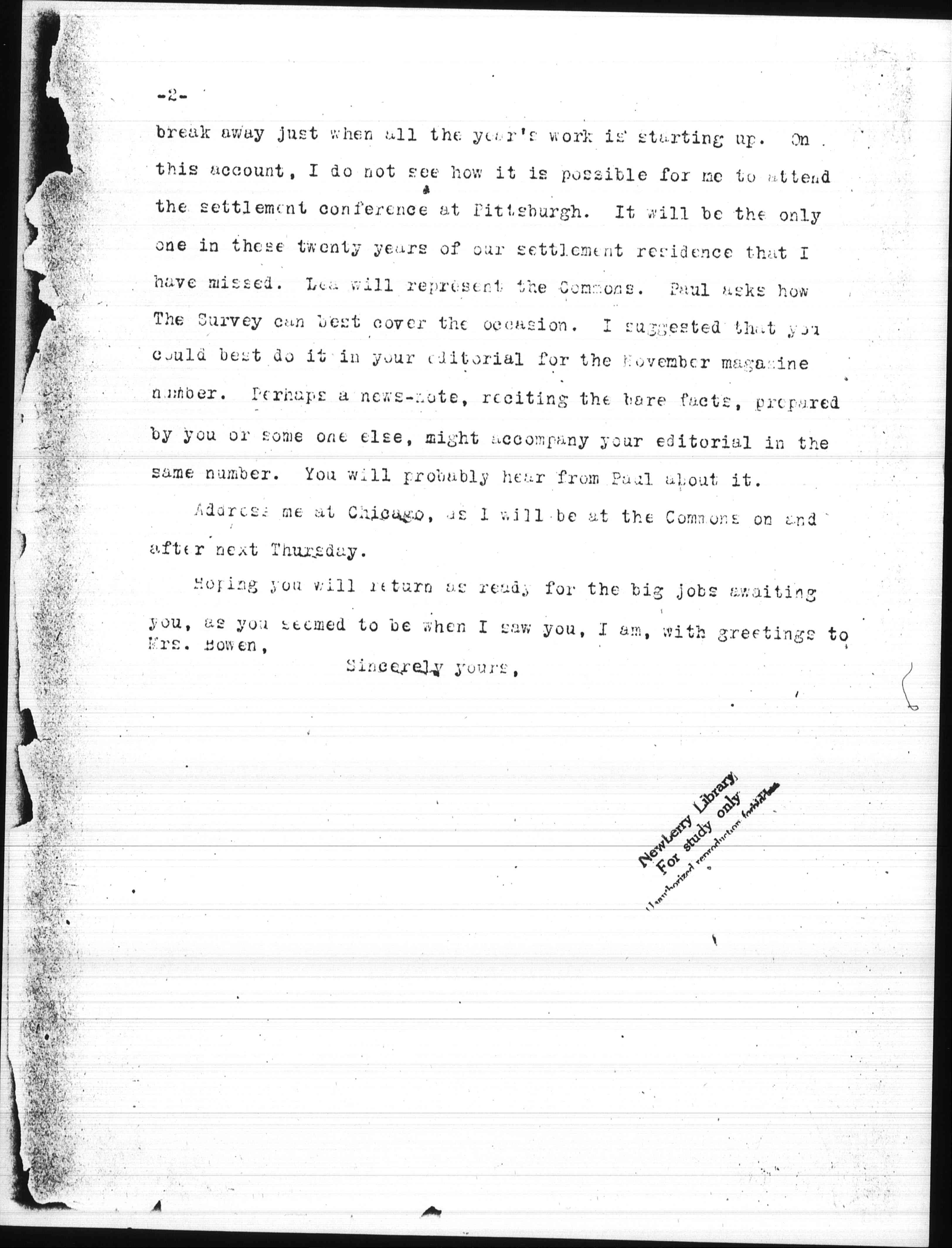 Paul Kellogg urges me to come to New York for a Survey directors' meeting about September 22d, but I really cannot [page 2] break away just when all the year's work is starting up. On this account, I do not see how it is possible for me to attend the settlement conference in Pittsburgh. It will be the only one in these twenty years of our settlement residence that I have missed. Lea will represent the Commons. Paul asks how The Survey can best cover the occasion. I suggested that you could best do it in your editorial for the November magazine number. Perhaps a news-note, reciting the bare facts, prepared by you or some one else, might accompany your editorial in the same number. You will probably hear from Paul about it.
