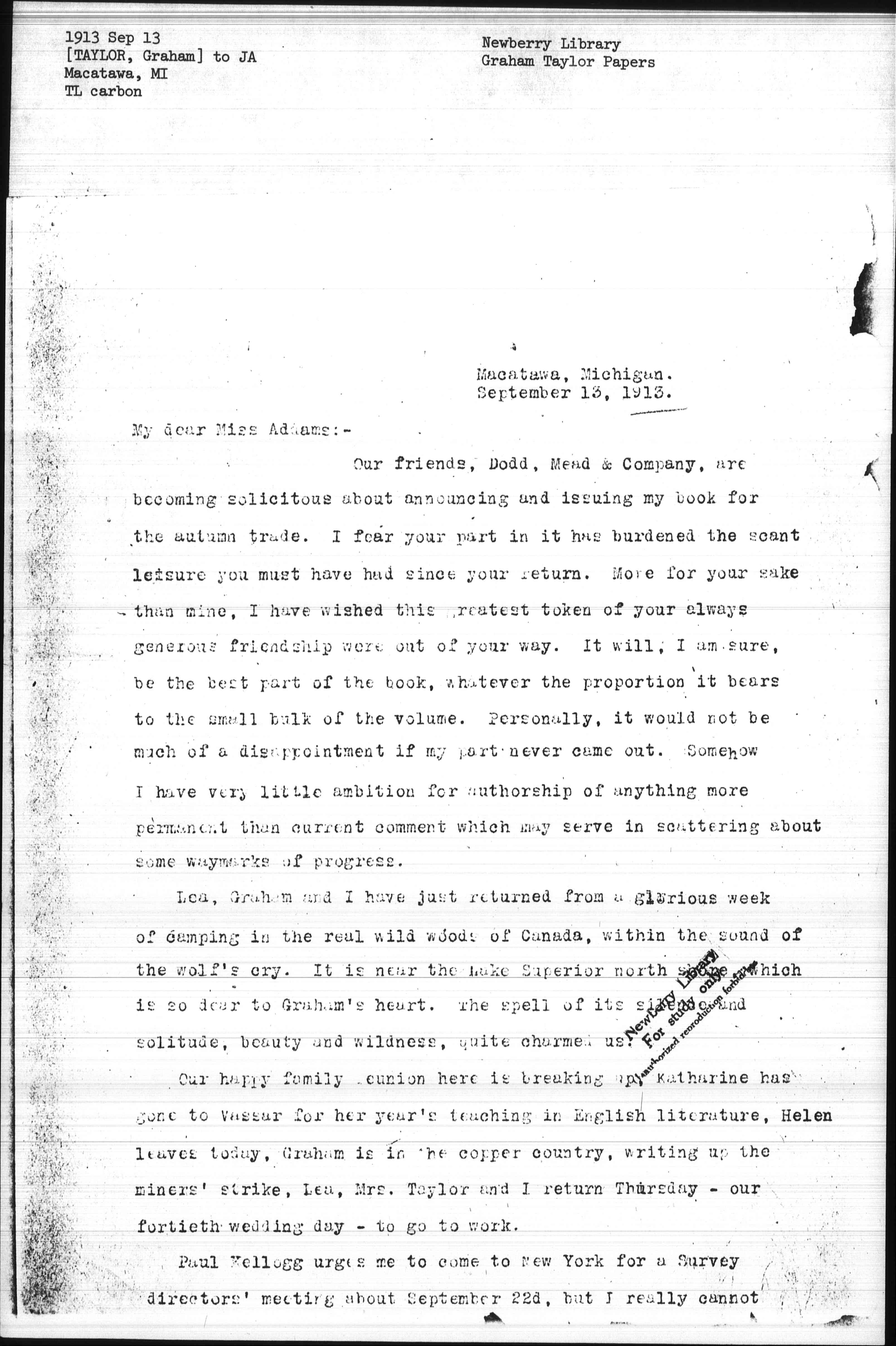 Our happy family reunion here is breaking up. Katherine has gone to Vassar for her year's teaching in English literature, Helen leaves today, Graham is in the copper country, writing up the miners' strike, Lea, Mrs. Taylor and I return Thursday -- our fortieth wedding day -- to go to work.