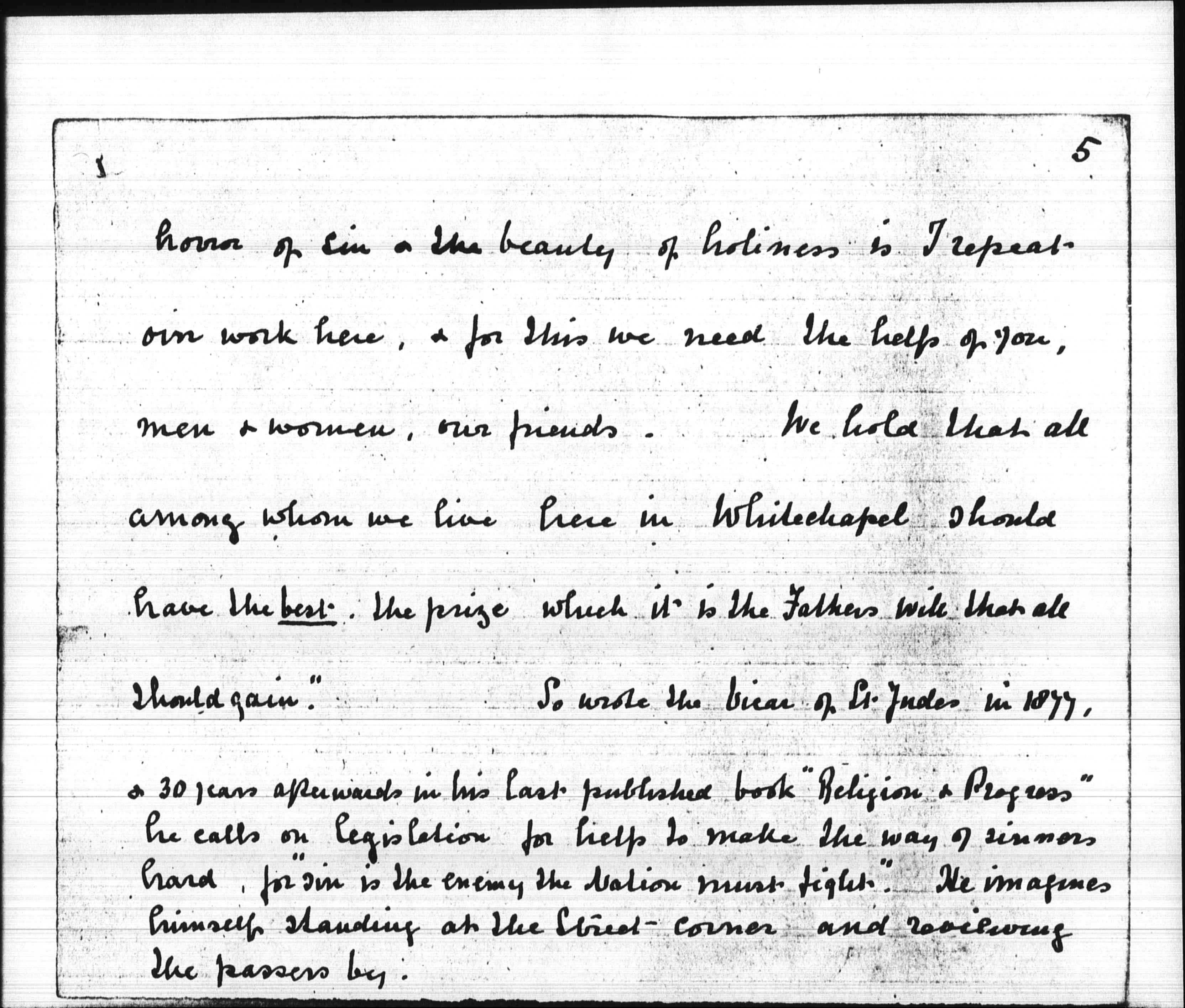 "To teach the [page 5] honor of sin & the beauty of holiness is I repeat our work here, & for this we need the help of you, men & women, our friends. We hold that all among whom we live here in Whitechapel should have the best. The prize which it is the Father's will that all should gain."