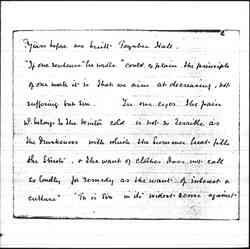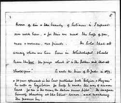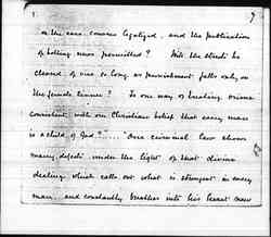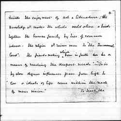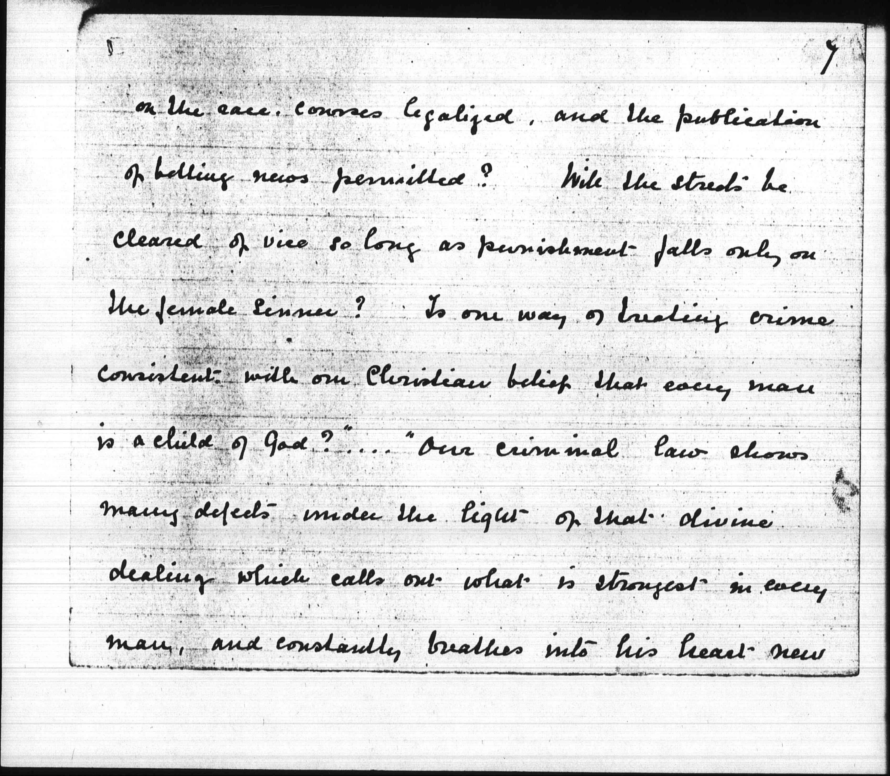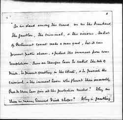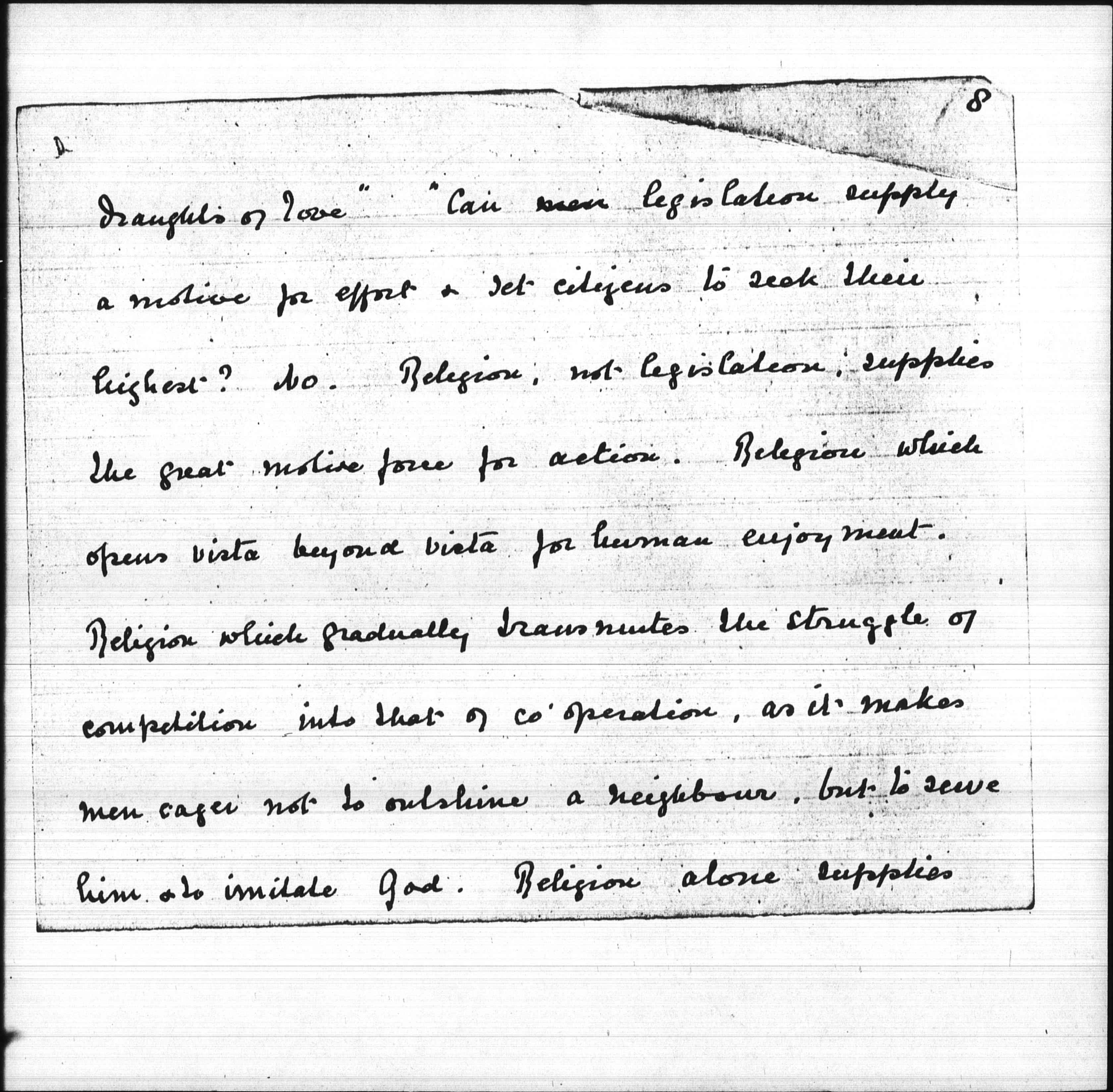 "As we stand among the crowd we see the drunkard, the gambler, the criminal, & the vicious. An Act of Parliament cannot make a man good, but it can prevent public abuses, & protect the innocent from some temptations. There are therefore laws to control the sale of drink, to prevent gambling in the streets, & to punish the criminal & the immoral livers who flaunt their immorality. But do these laws give all the protection needed? Why are there so many licensed drink shops? Why is gambling [page 7] on the race courses legalized, and the publication of [telling?] news permitted? Will the streets be cleared of vice so long as punishment falls only on the female sinner? Is one way of treating crime consistent with our Christian belief that every man is a child of God?" ... "Our criminal law shows many defects under the light of that divine dealing which calls out what is strongest in every man, and constantly breathes into his heart new [page 8] draughts of love" "Can [illegible] legislation supply a motive for effort & set citizens to seek their highest? No. Religion, not legislation, supplies the great motive force for action. Religion which opens vista beyond vista for human enjoyment. Religion which gradually transmutes the struggle of competition into that of [cooperation], as it makes men eager not to outshine a neighbor, but to serve him & to imitate God. Religion alone supplies [page 9] an eternal motive for striving."