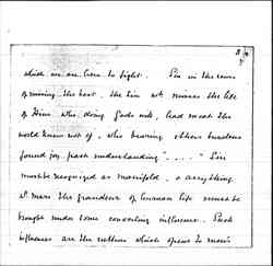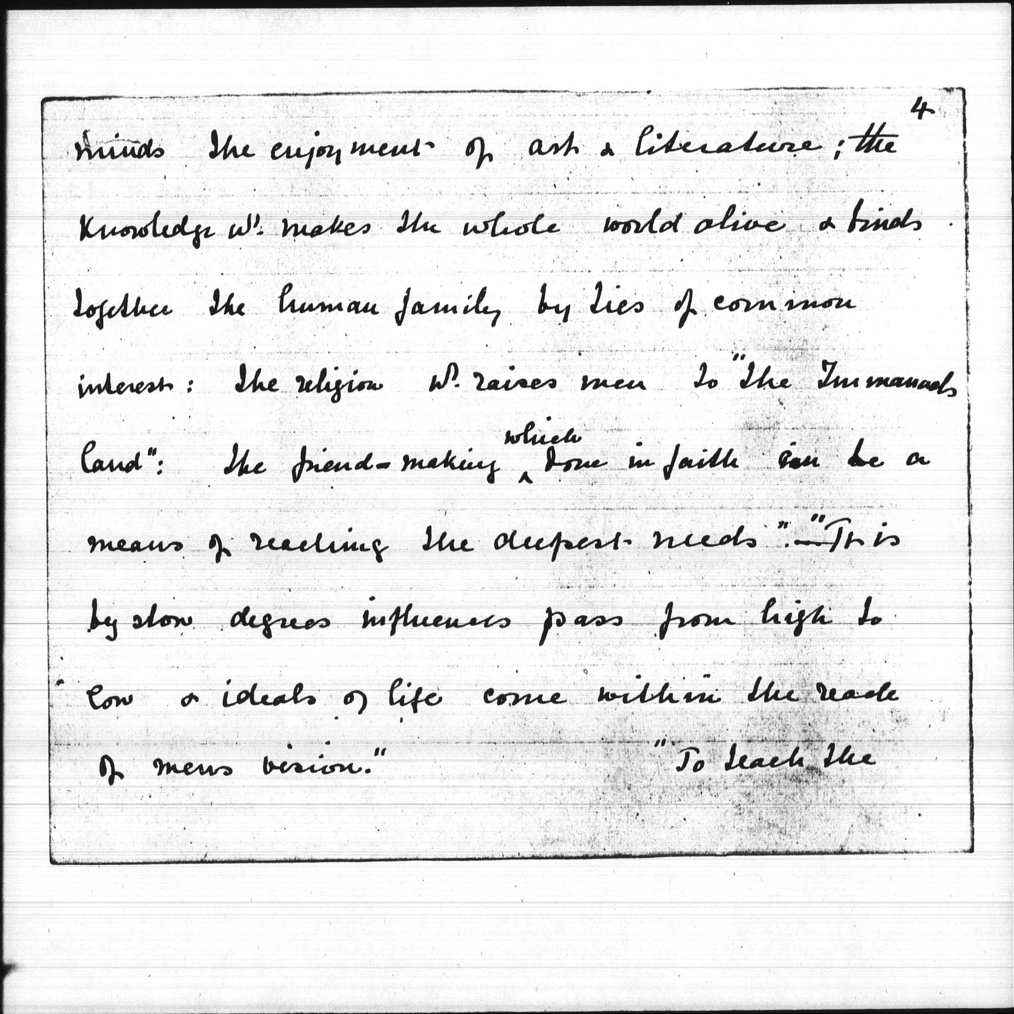"If one sentence" he wrote "could explain the principle of one work it is that we aim at decreasing, not suffering but sin. In our eyes the pain [which] belongs to the winter cold is not so terrible as the [drunkenness] with which the summer heat fills the streets, & the want of clothes does not call so loudly for remedy as the want of interest & culture" "It is sin in its widest sense against [page 3] which we are here to fight. Sin in the sense of missing the best. The sin [which] misses the life of Him who doing Gods will, had meat the world knew not of, who bearing others burdens found joy past understanding" ... "Sin must be recognized as manifold, & anything [which] mars the grandeur of human life must be brought under some converting influence. Such influences are the culture which opens to men's [page 4] minds the enjoyment of art & literature; the knowledge [which] makes the whole world alive & binds together the human family by ties of common interest: the religion [which] raises men to 'the Immanuel's land': the friend-making <which> done in faith can be a means of reaching the deepest needs." "It is by slow degrees influences pass from high to low & ideals of life come within the reach of men's vision."