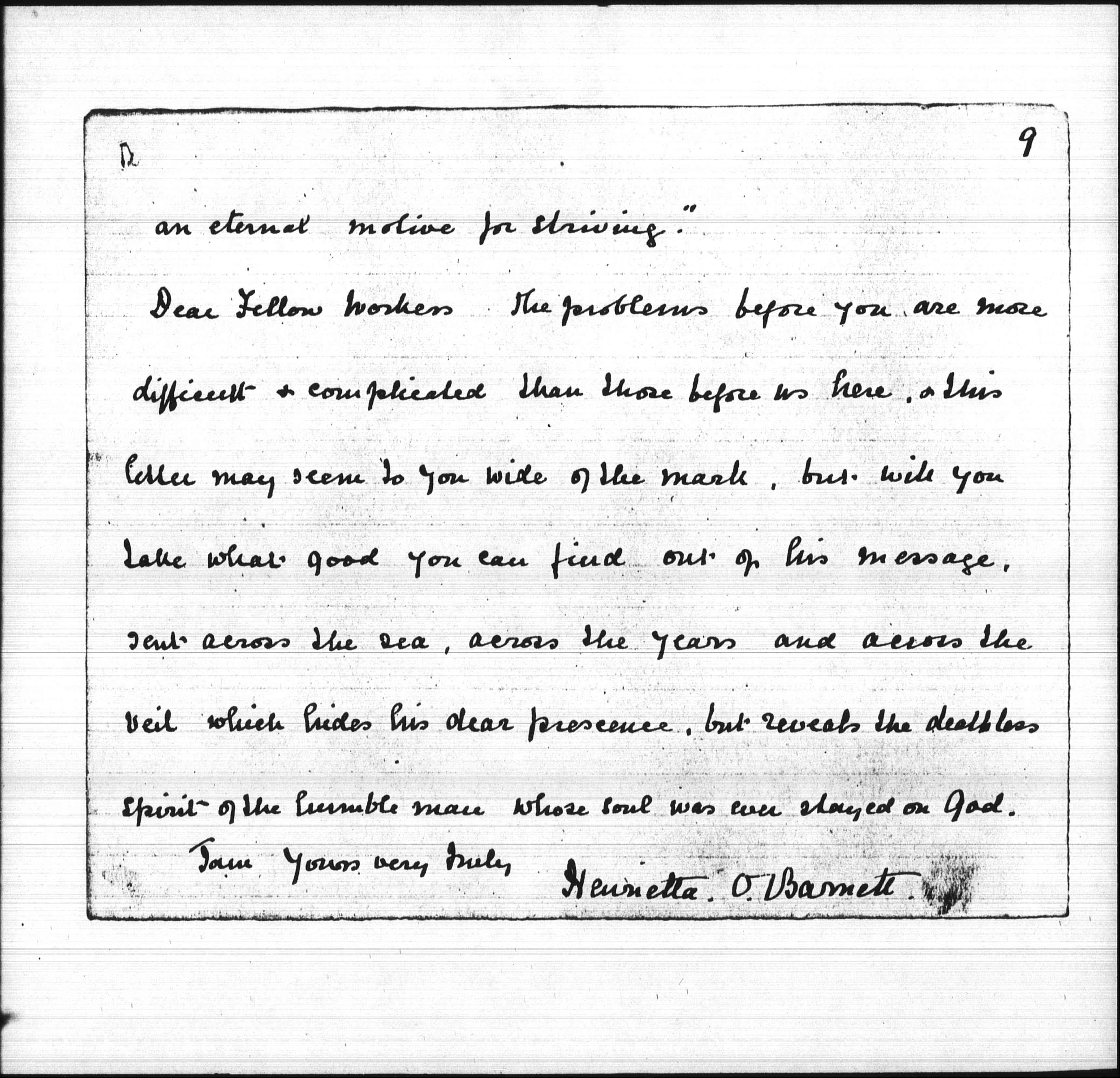 Dear Fellow Workers the problems before you are more difficult & complicated than those before us here, & this letter may seem to you wide of the mark, but will you take what good you can find out of his message, sent across the sea, across the years and across the veil which hides his dear presence, but reveals the deathless spirit of the humble man whose soul was ever stayed on God.