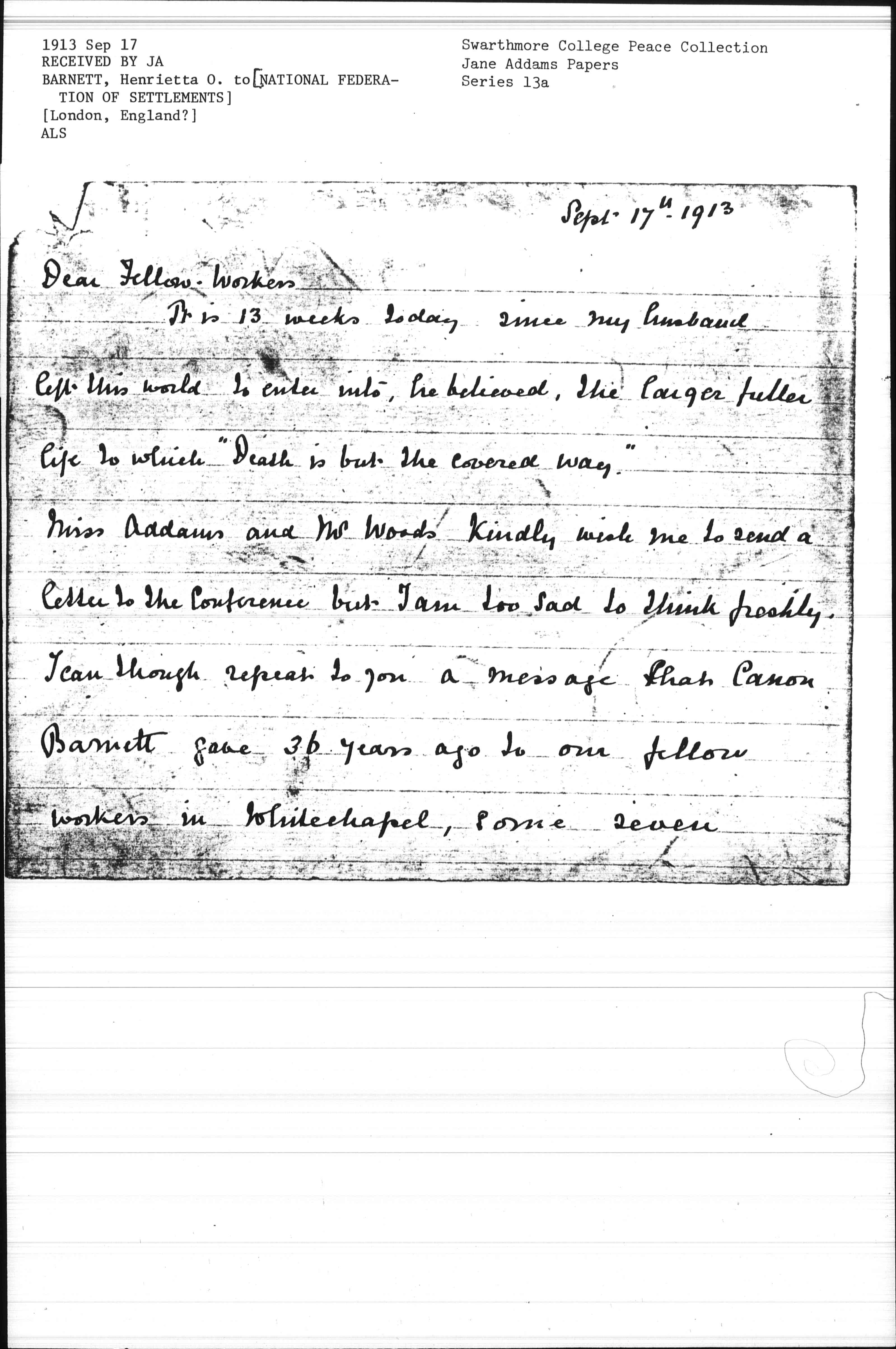 Miss Addams and Mr Woods kindly wish me to send a letter to the Conference but I am too sad to think freshly. I can though repeat to you a message that Canon Barnett gave 36 years ago to our fellow workers in Whitechapel, some seven [page 2] years before we built Toynbee Hall.