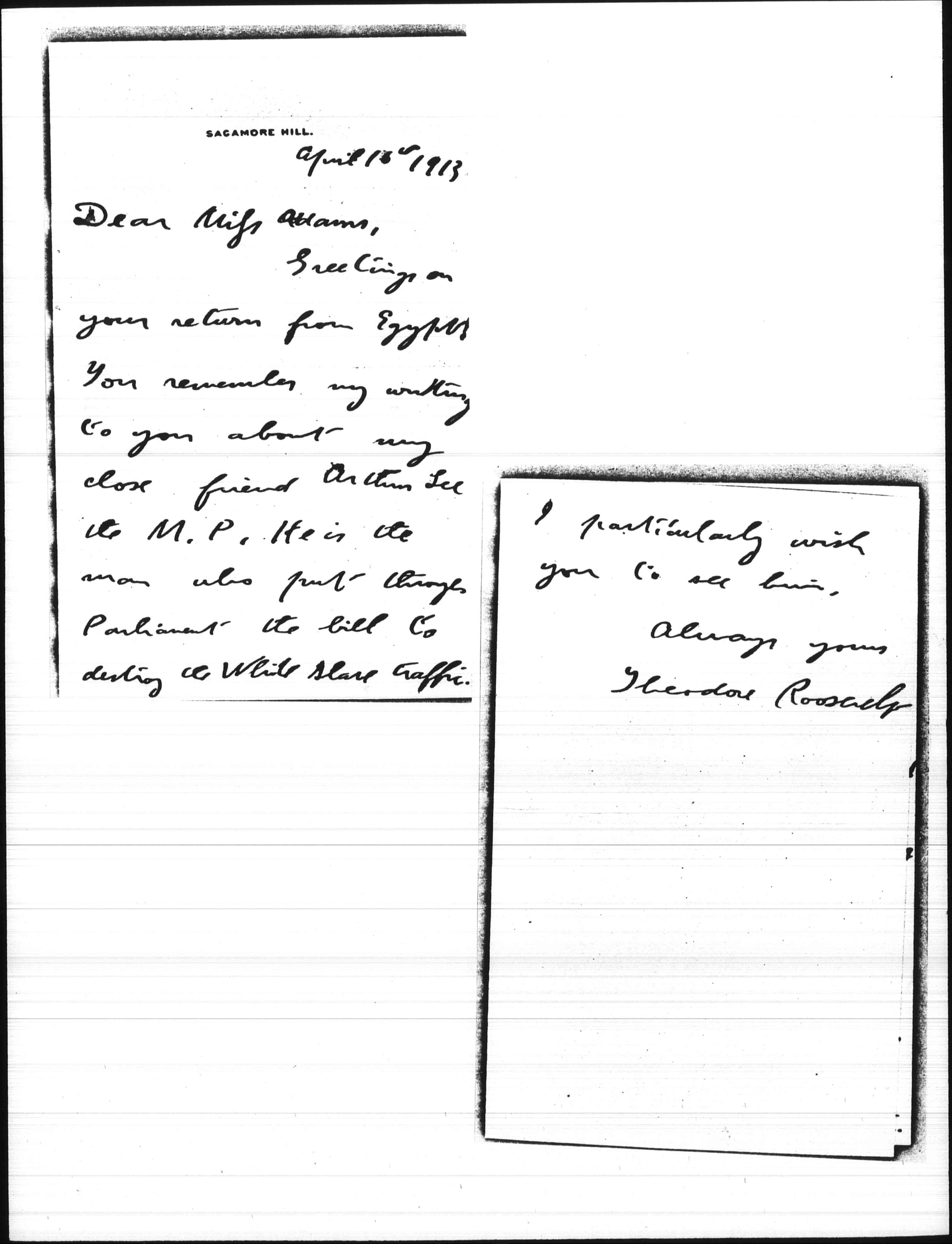Greetings on your return from Egypt! You remember my writing to you about my close friend Arthur Lee the M.P. He is the man who put through Parliament the bill to destroy the white slave traffic. [page 2] I particularly wish you to see him.