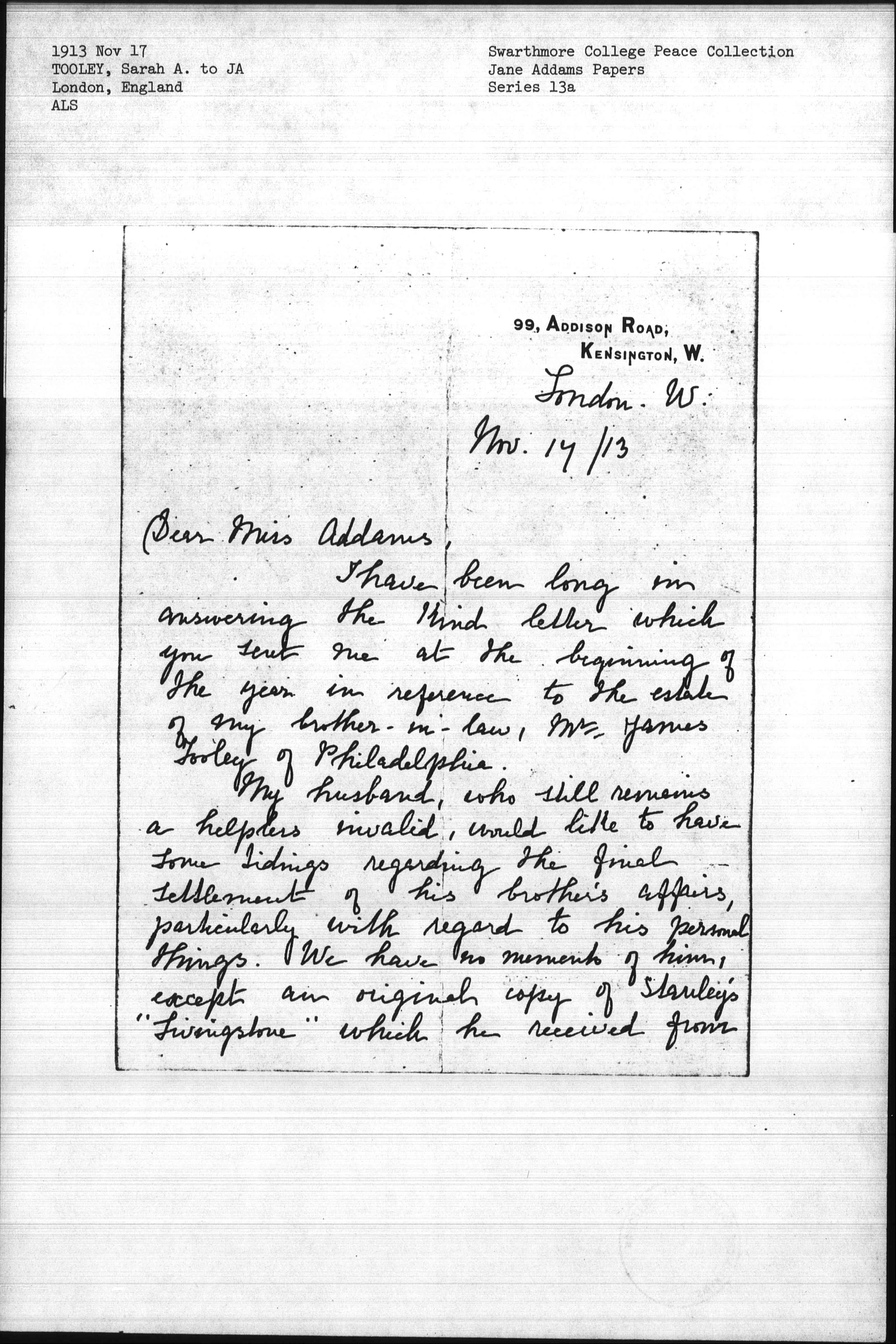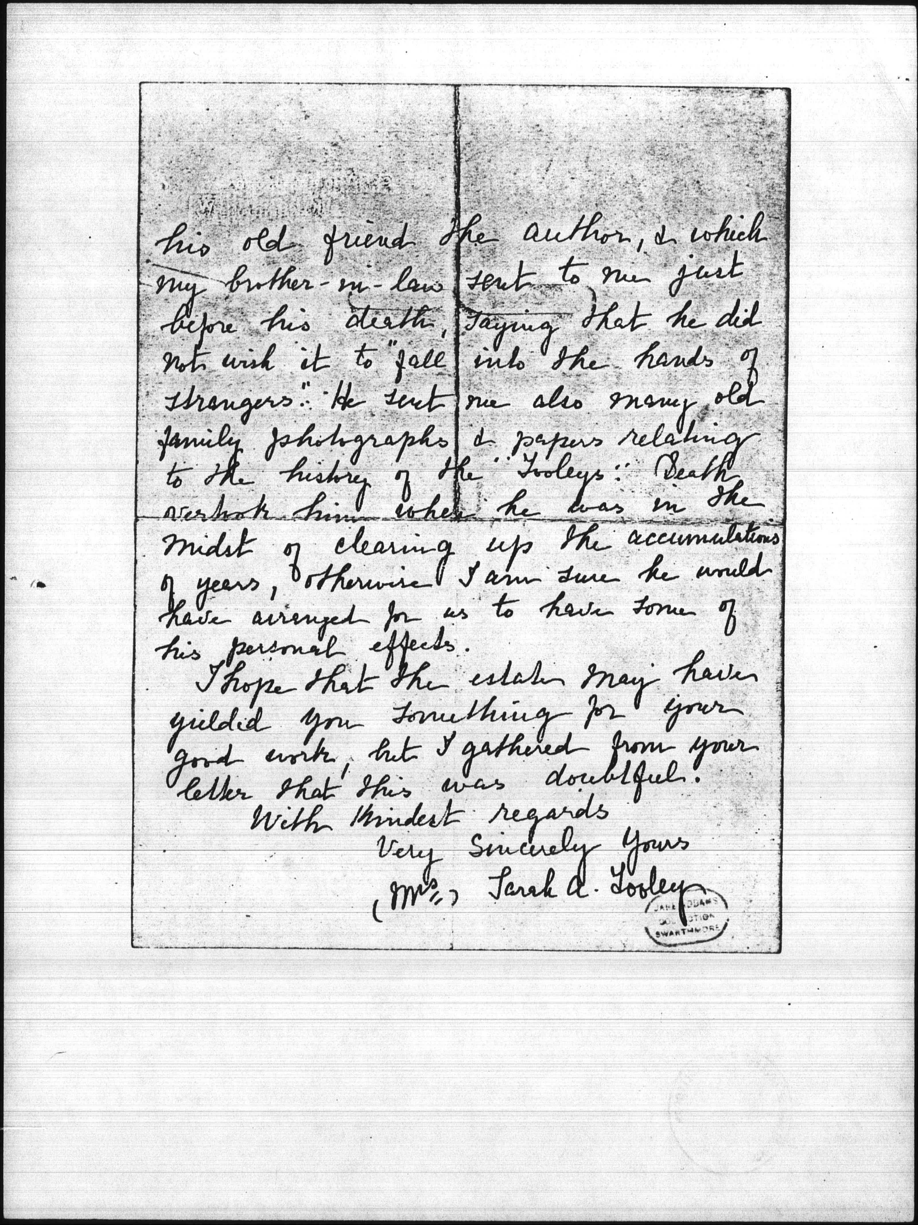My husband, who still remains a helpless invalid, would like to have some tidings regarding the final settlement of his brother's affairs, particularly with regard to his personal things. We have no memento of him, except an original copy of Stanley's "Livingstone" which he received from [page 2] his old friend the author, & which my brother-in-law sent to me just before his death, saying that he did not wish it to "fall into the hands of strangers." He sent me also many old family photographs & papers relating to the history of the "Tooleys." Death overtook him when he was in the midst of clearing up the accumulations of years, otherwise I am sure he would have arranged for us to have some of his personal effects.