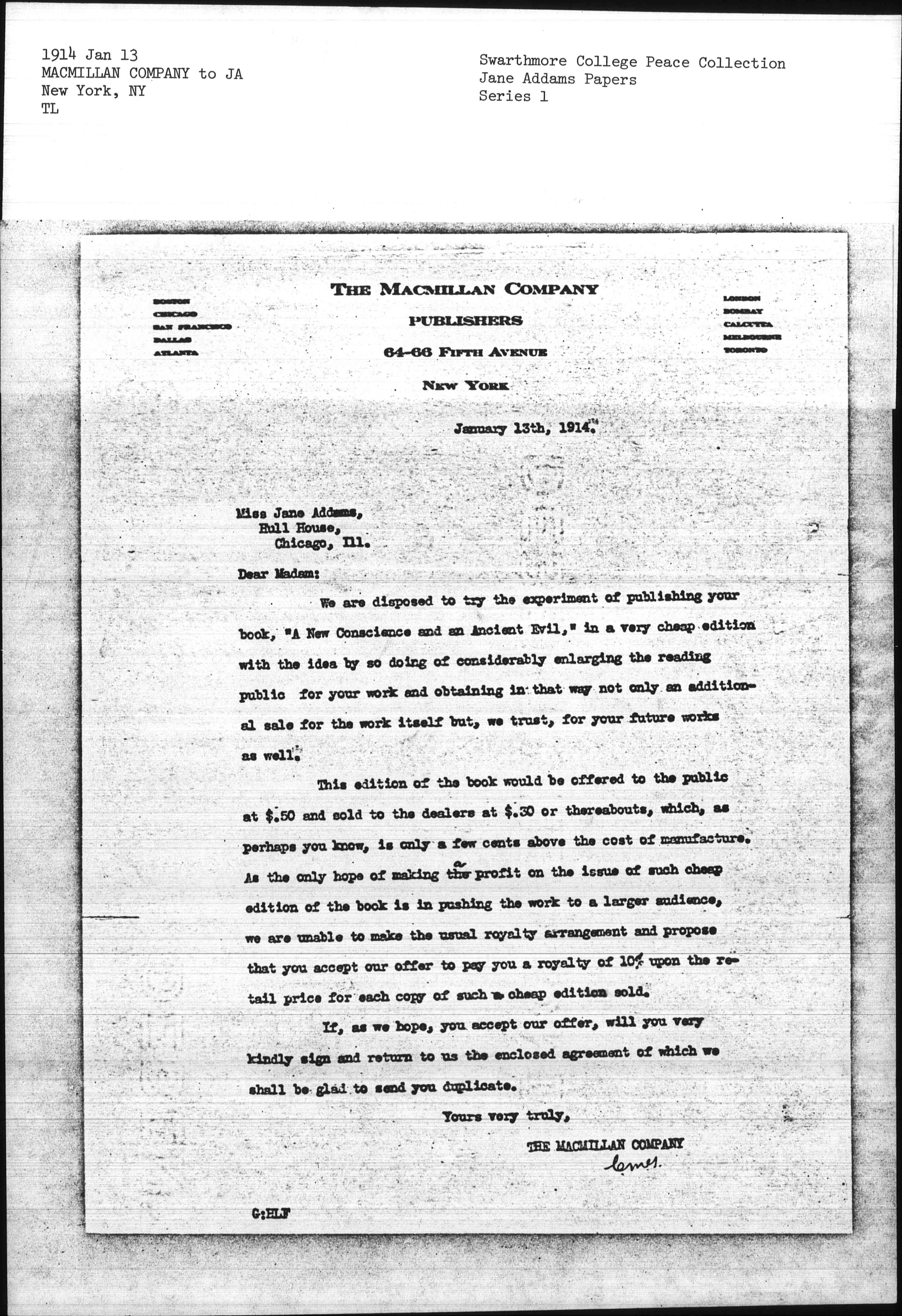We are disposed to try the experiment of publishing your book, "A New Conscience and an Ancient Evil," in a very cheap edition with the idea by so doing of considerably enlarging the reading public for your work and obtaining in that way not only an additional sale for the work itself but, we trust, for your future works as well.