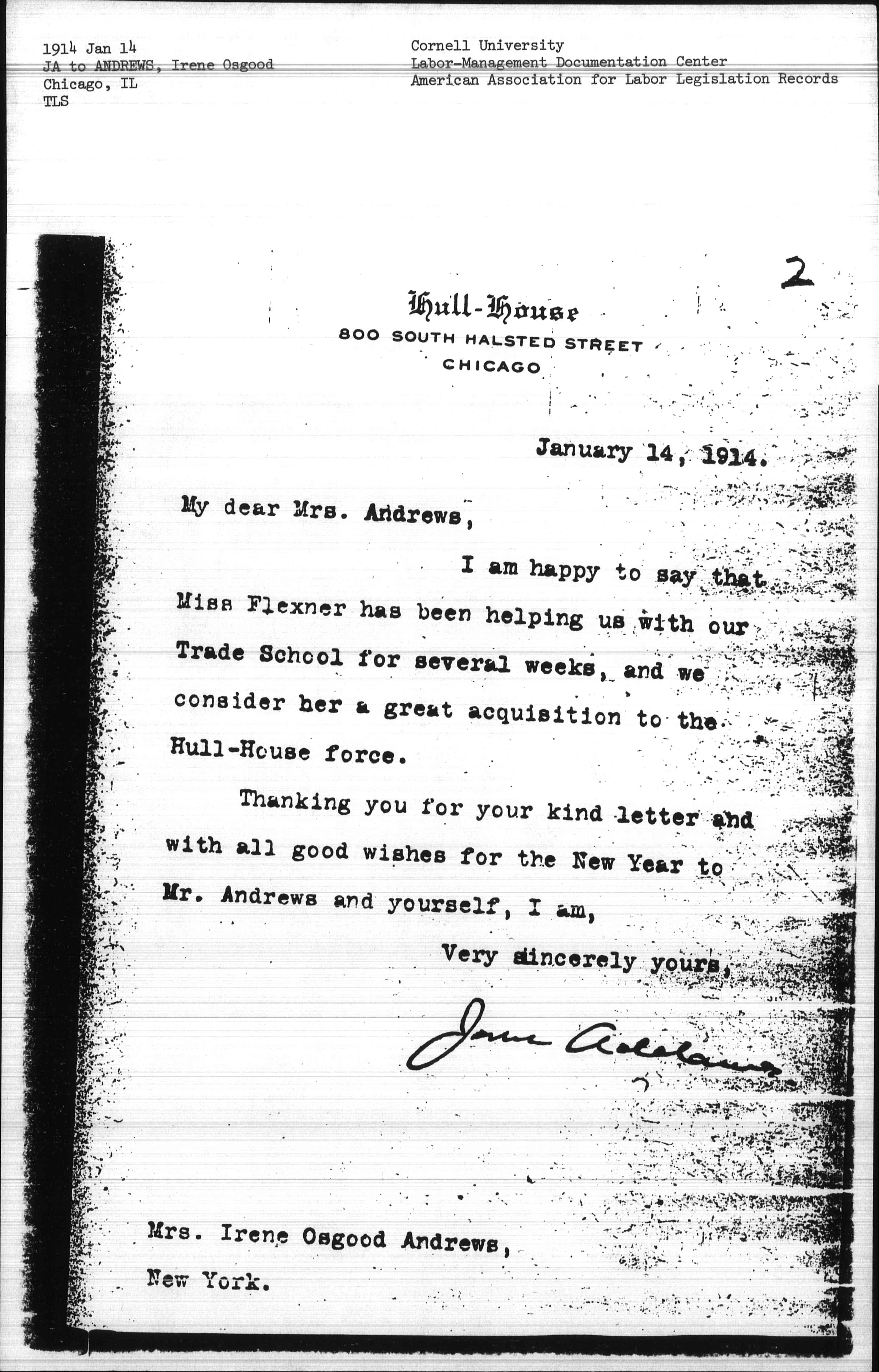 I am happy to say that Miss Flexner has been helping us with our Trade School for several weeks, and we consider her a great acquisition to the Hull-House force.