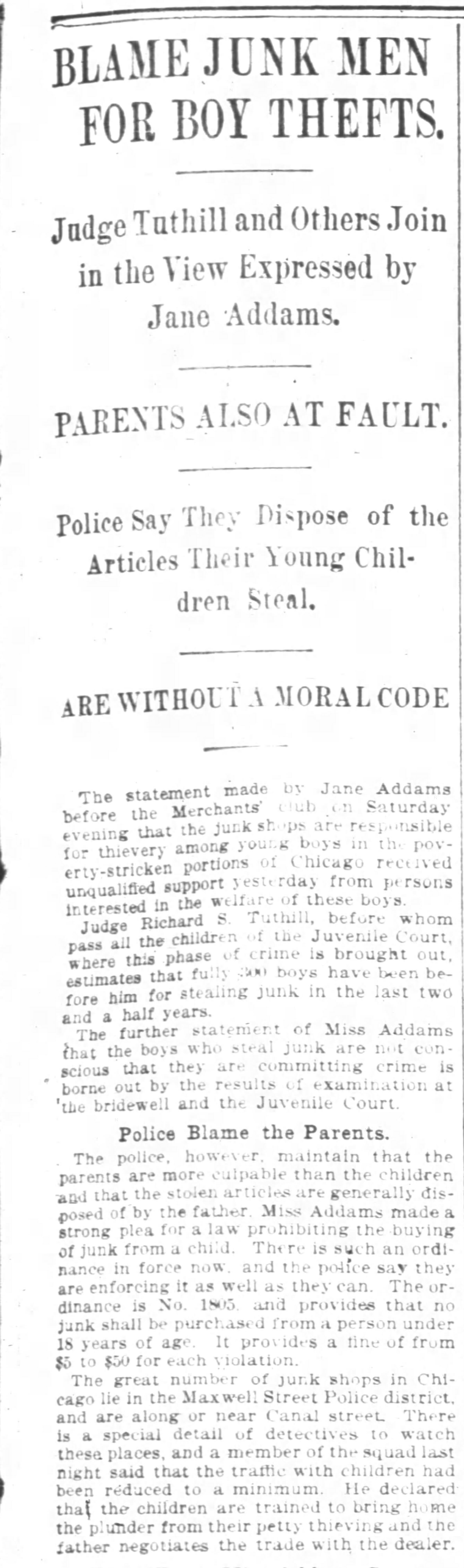 The police, however, maintain that the parents are more culpable than the children and that the stolen articles are generally disposed of by the father. Miss Addams made a strong plea for a law prohibiting the buying of junk from a child. There is such an ordinance in force now, and the police say they are enforcing it as well as they can. The ordinance is No. 1805, and provides that no junk shall be purchased from a person under 18 years of age. It provides a fine of from $5 to $50 for each violation.