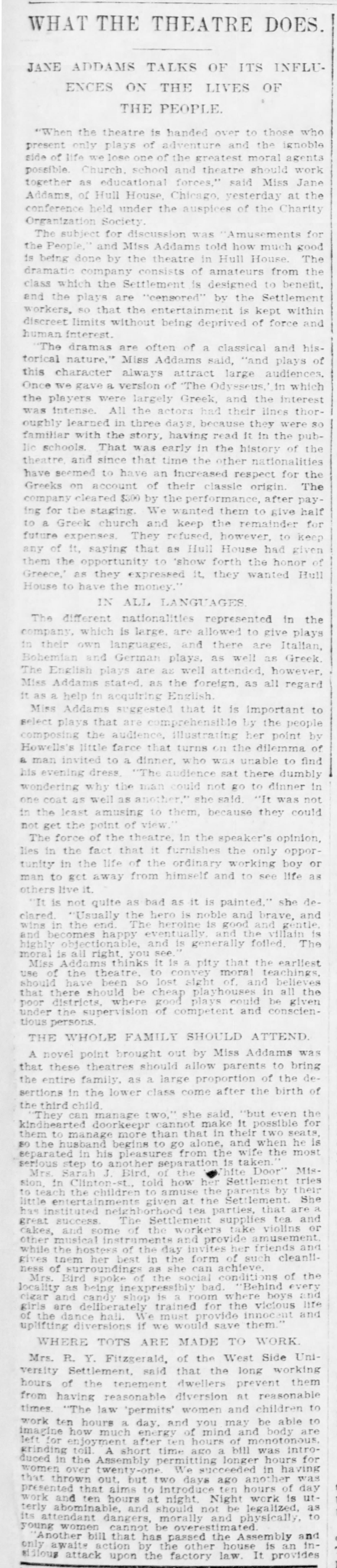 "When the theatre is handed over to those who present only plays of adventure and the ignoble side of life we lose of the greatest moral agents possible. Church, school and theatre should work together as educational forces," said Miss Jane Addams, of Hull House, Chicago, yesterday at the conference held under the auspices of the Charity Organization Society.