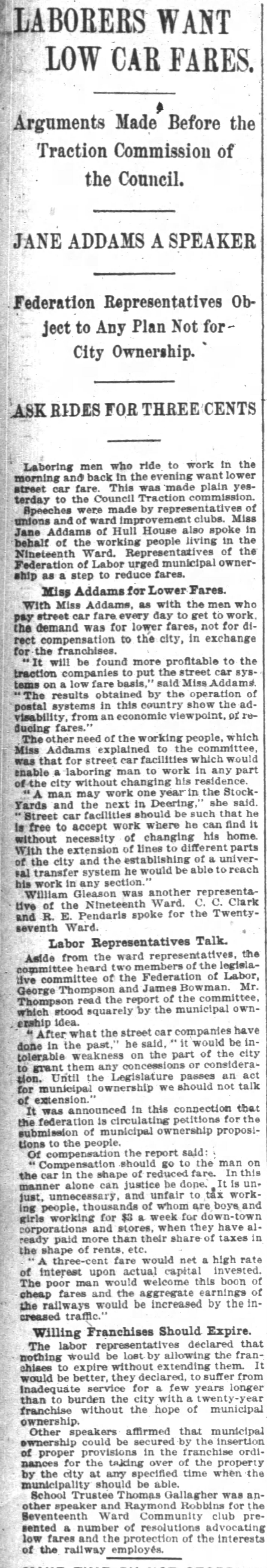 The other need of the working people, which Miss Addams explained to the committee, was that for street car facilities which would enable a laboring man to work in any part of the city without changing his residence.