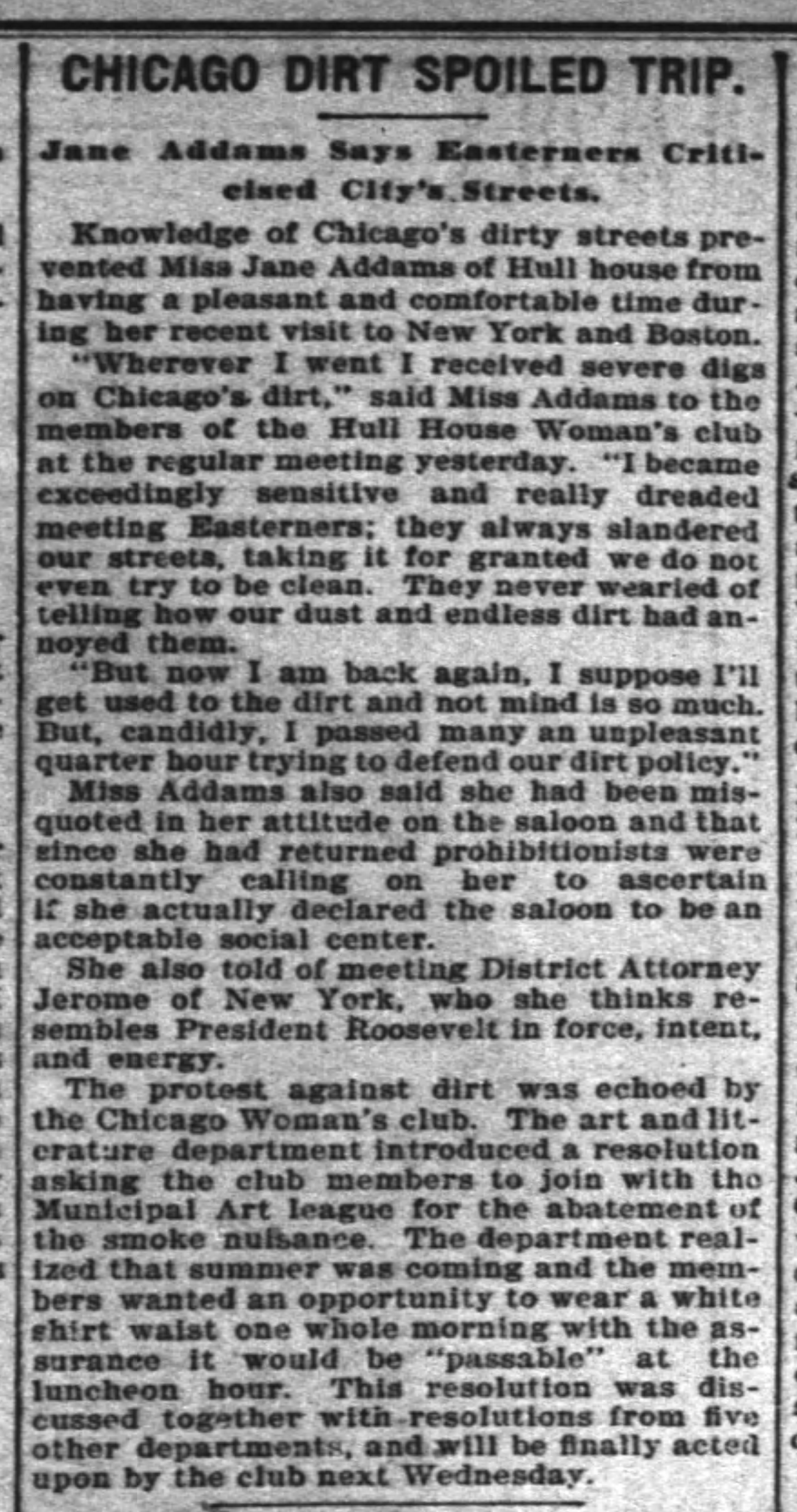 "Wherever I went I received severe digs on Chicago's dirt," said Miss Addams to the members of the Hull House Woman's club at the regular meeting yesterday. "I became exceedingly sensitive and really dreaded meeting Easterners; they always slandered our streets, taking it for granted we do not even try to be clean. They never wearied of telling how our dust and endless dirt had annoyed them.