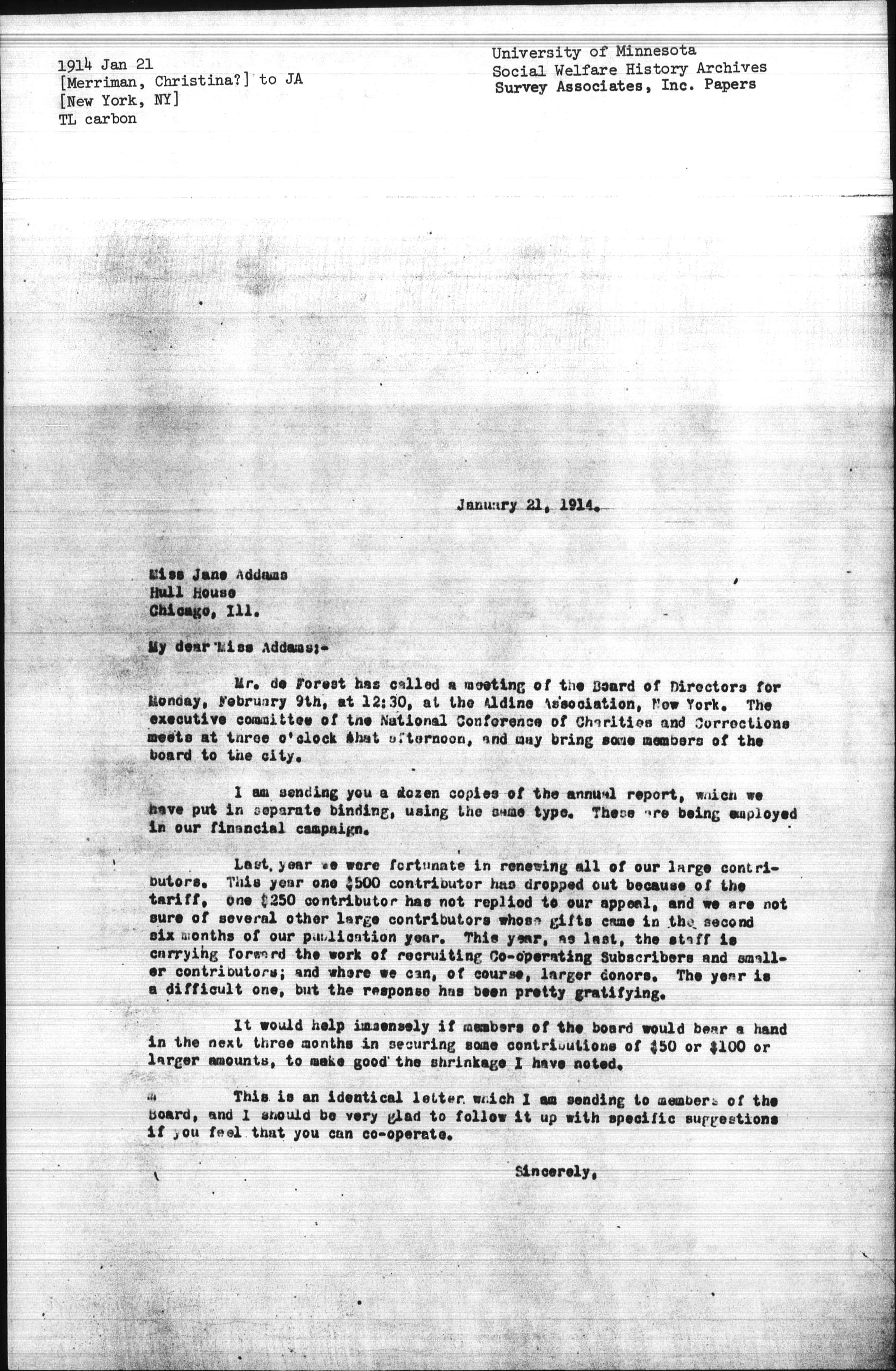 Mr. DeForest has called a meeting of the Board of Directors for Monday, February 9th, at 12:30, at the Aldine Association, New York. The executive committee of the National Conference of Charities and Corrections meets at three o'clock that afternoon, and may bring some members of the board to the city.