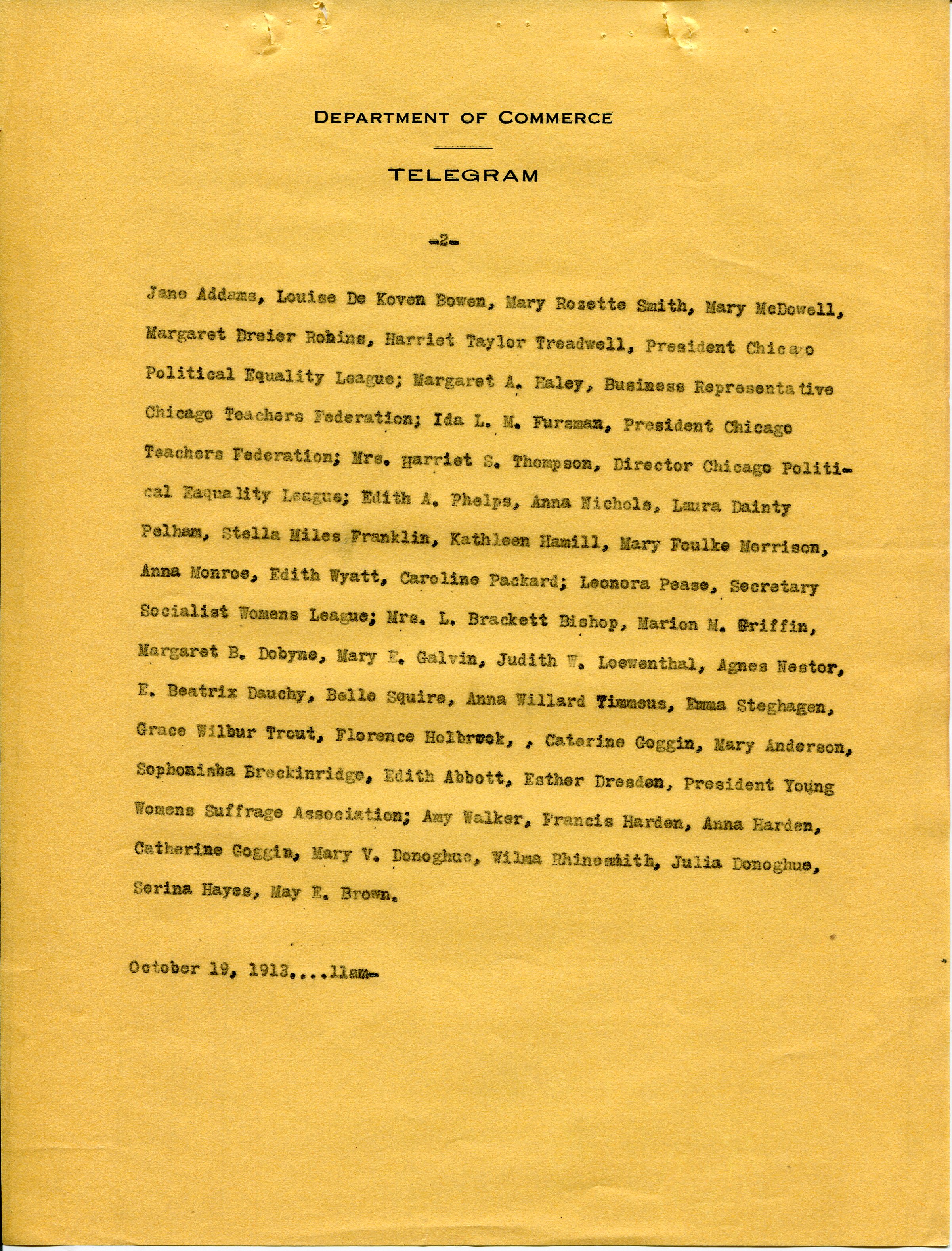 Jane Addams, Louise de Koven Bowen, Mary [Rozet] Smith, Mary McDowell, Margaret Dreier Robins, [Harriette] Taylor Treadwell, President Chicago Political Equality League; Margaret A. Haley, Business Representative Chicago Teachers Federation; Ida L. M. Fursman, President Chicago Teachers Federation; Mrs. Harriet S. Thompson, Director Chicago Political [Equality] League; [Editha] Phelps, Anna [Nicholes], Laura Dainty Pelham, Stella Miles Franklin, Kathleen Hamill, Mary Foulke [Morrisson], Anna Monroe, Edith Wyatt, Caroline Packard; Leonora Pease, Secretary Socialist Womens League; Mrs. L. Brackett Bishop, [Marian] M. Griffin, Margaret B. Dobyne, Mary E. Galvin, Judith W. Loewenthal, Agnes Nestor, E. Beatrix Dauchy, Belle Squire, Anna Willard [Timeus], Emma Steghagen, Grace Wilbur Trout, Florence Holbrook, [Catharine] Goggin, Mary Anderson, Sophonisba Breckinridge, Edith Abbott, Esther Dresden, President Young Womens Suffrage Association; Amy Walker, [Frances] Harden, Anna Harden, [Catharine] Goggin, Mary V. Donoghue, Wilma Rhinesmith, Julia Donoghue, Serina Hayes, May E. Brown.