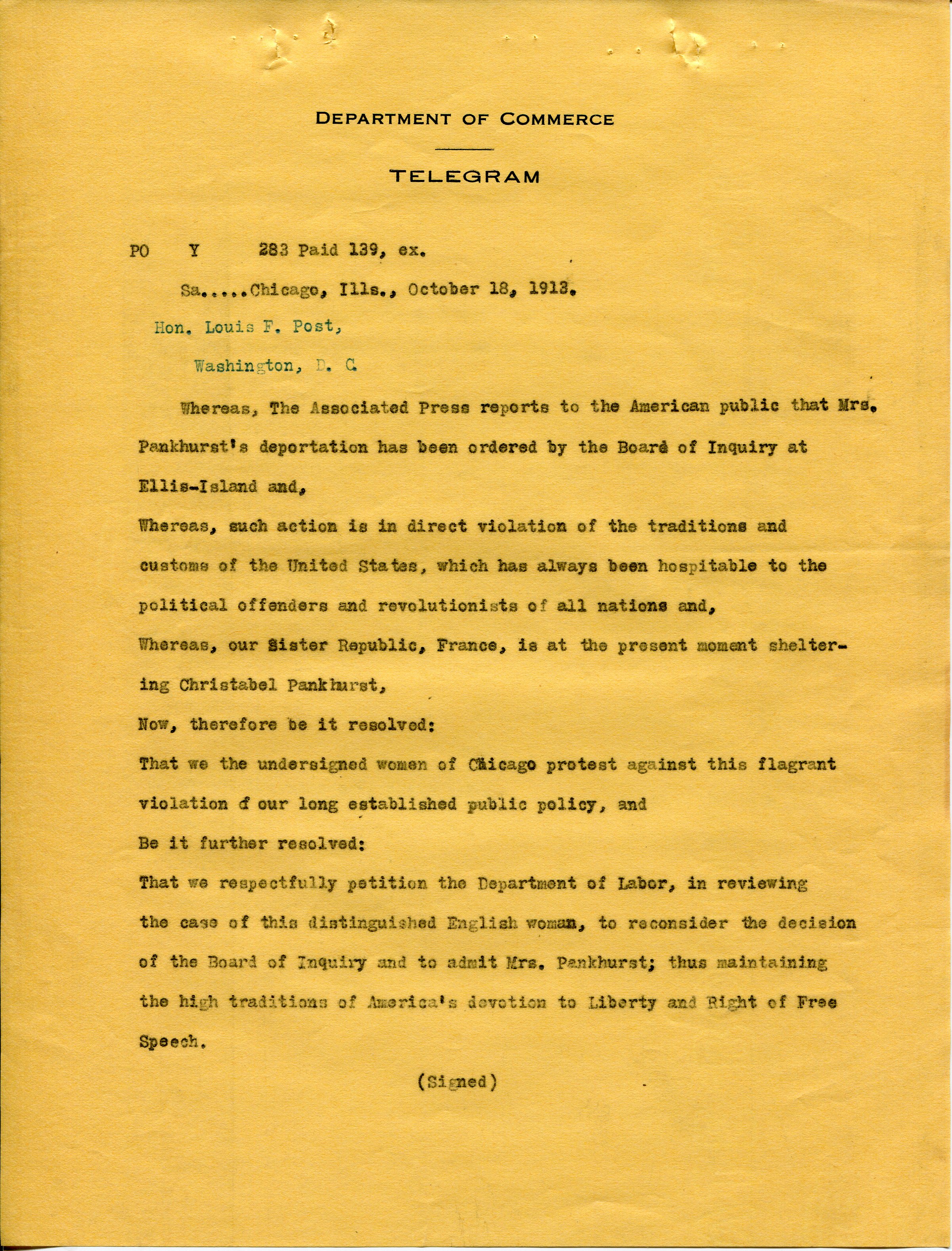 That we respectfully petition the Department of Labor, in reviewing the case of this distinguished English woman, to reconsider the decision of the Board of Inquiry and to admit Mrs. Pankhurst; thus maintaining the high traditions of America's devotion to Liberty and Right of Free Speech.