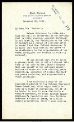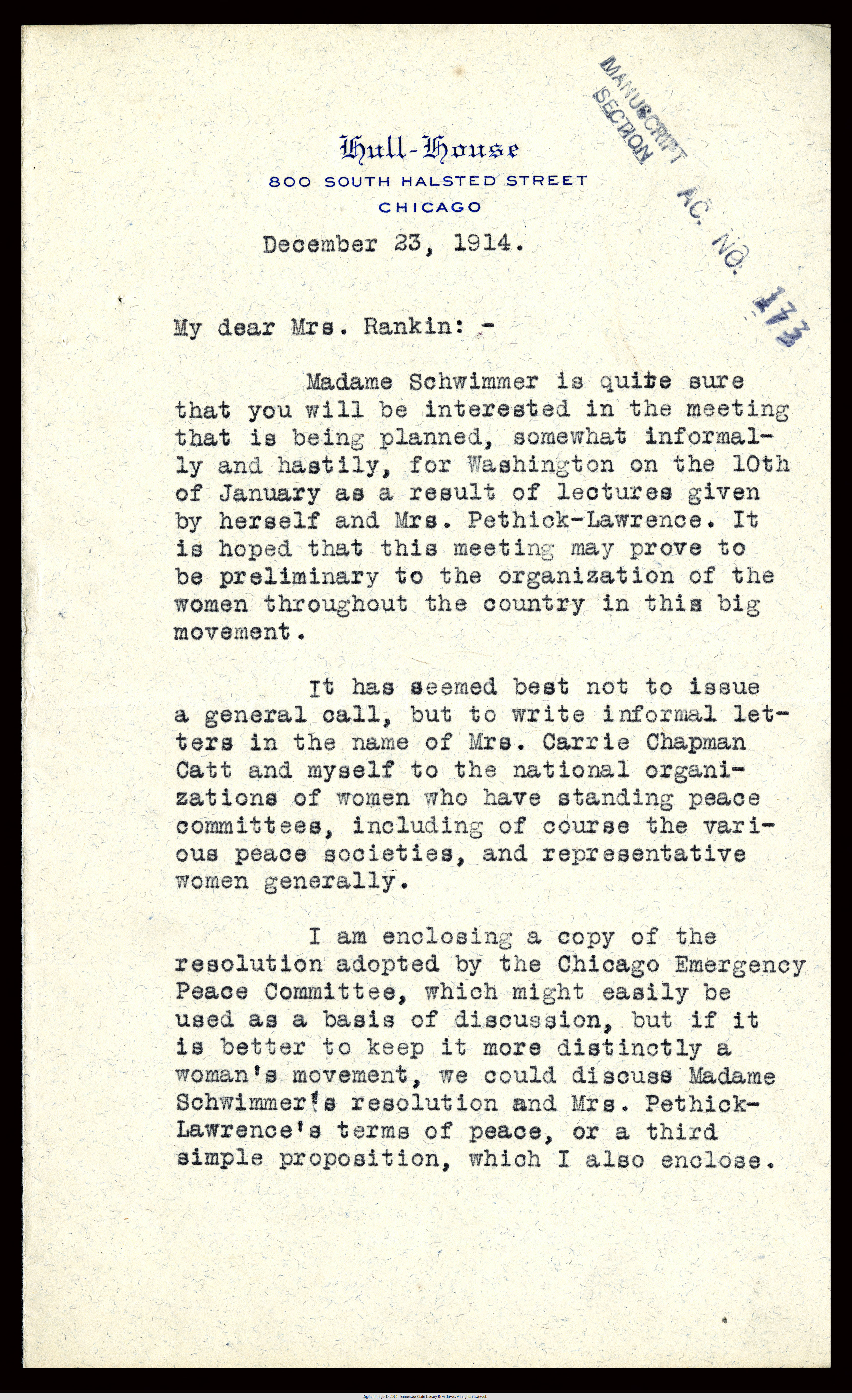 I am enclosing a copy of the resolution adopted by the Chicago Emergency Peace Committee, which might easily be used as a basis of discussion, but if it is better to keep it more distinctly a woman's movement, we could discuss Madame Schwimmer's resolution and Mrs. Pethick-Lawrence's terms of peace, or a third simple proposition, which I also enclose. [page 2]