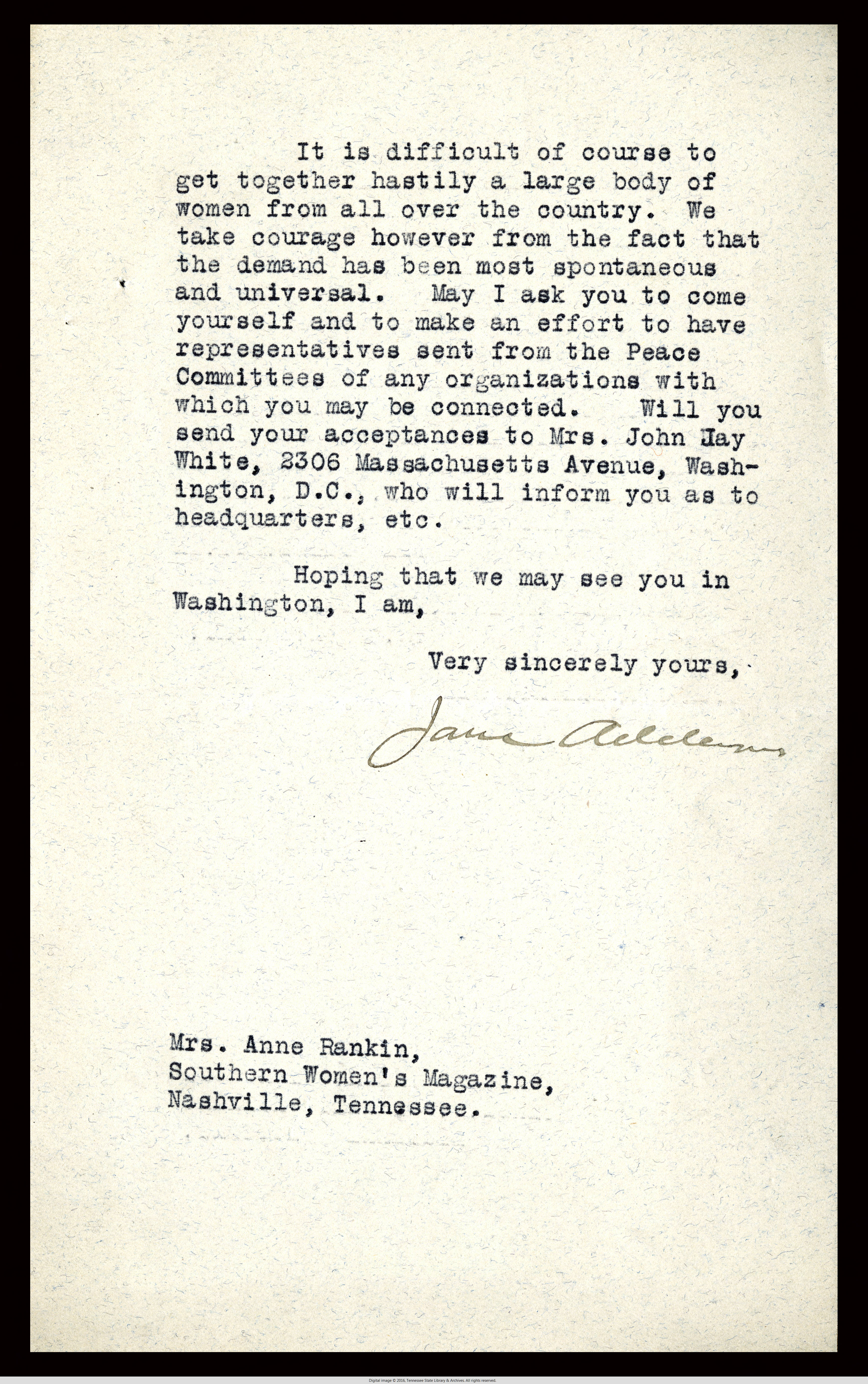 It is difficult of course to get together hastily a large body of women from all over the country. We take courage however from the fact that the demand has been most spontaneous and universal. May I ask you to come yourself and to make an effort to have representatives sent from the Peace Committees of any organizations with which you may be connected. Will you send your acceptances to Mrs. John Jay White, 2306 Massachusetts Avenue, Washington, D.C., who will inform you as to headquarters, etc.