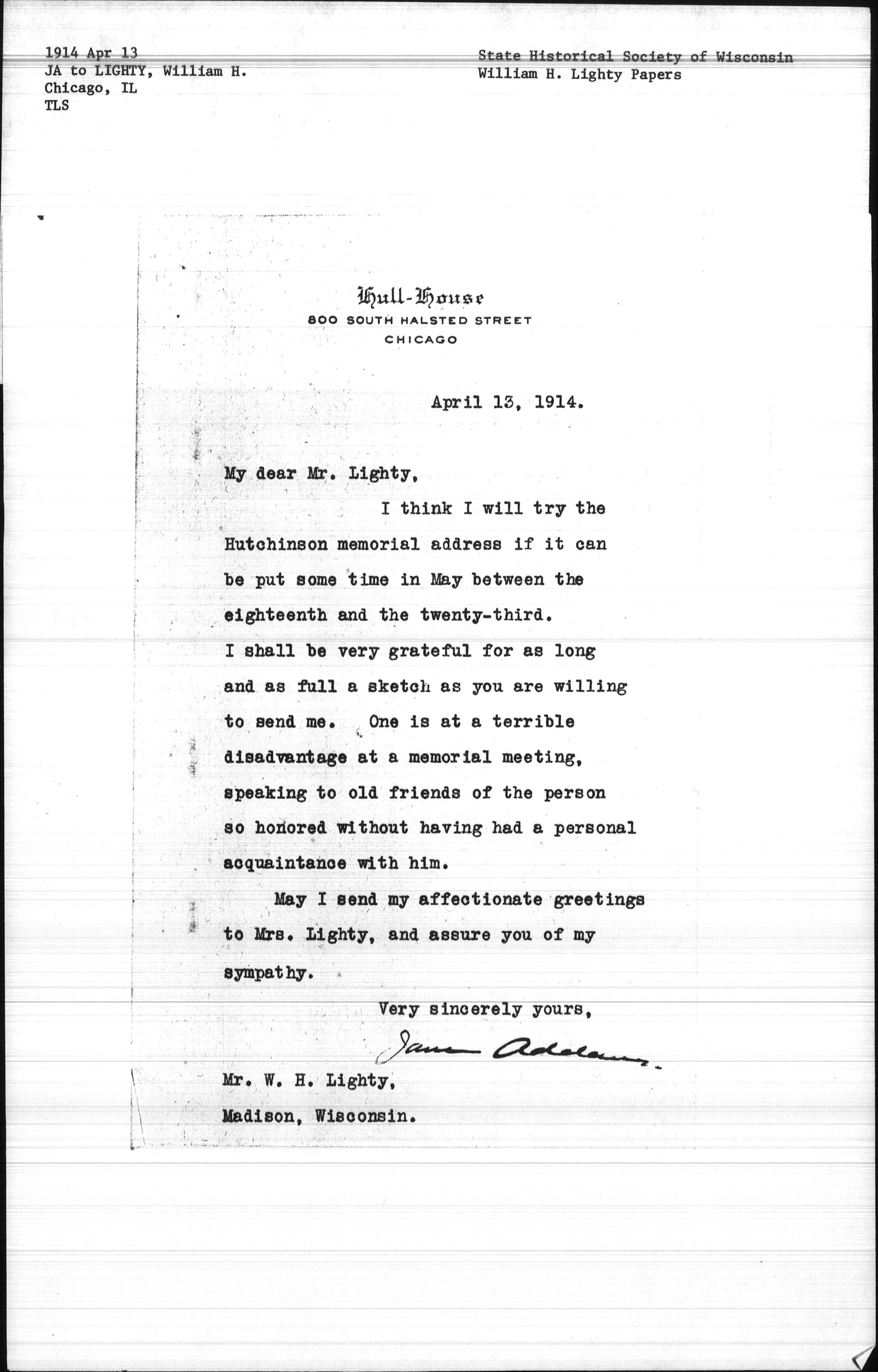 Jane Addams. [signed]
